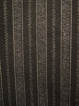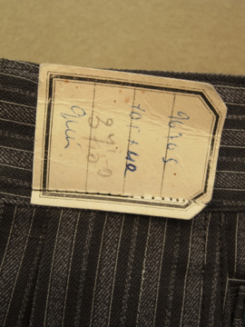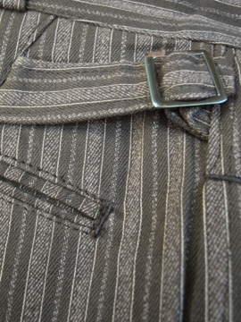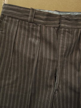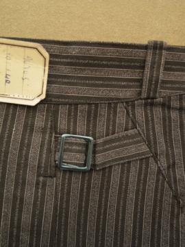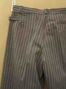 1940年代頃につくられたストライプ織りのコットン・ワークパンツ。デッドストック品です。サイドにストラップ、ウエスト周りにベルトループがつく仕様。フロントはボタンフライ、ボタンは黒塗りのメタル製、ボタンホールは手縫いです。金具に多少サビがあります。初めて洗濯する際に多少縮む可能性があります。とても丁寧につくられた良い品です。多少薄い汚れがありますが、状態はとても良いです。