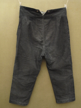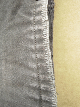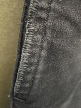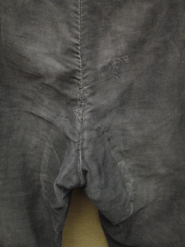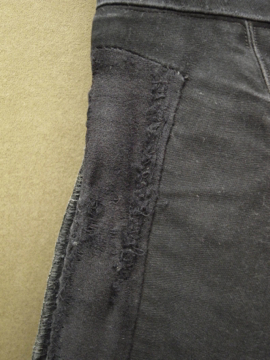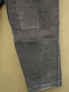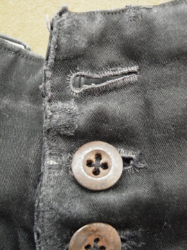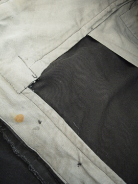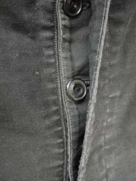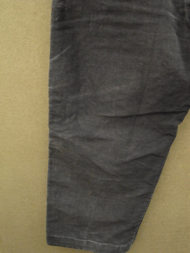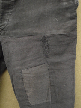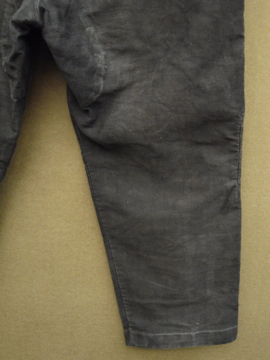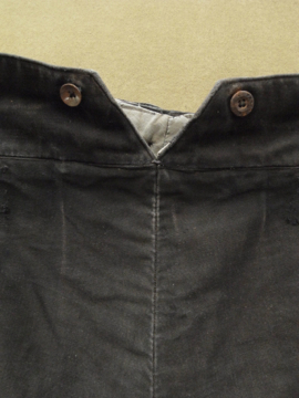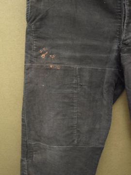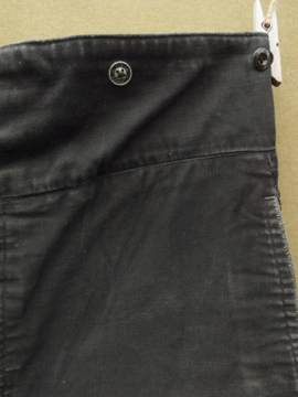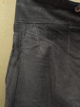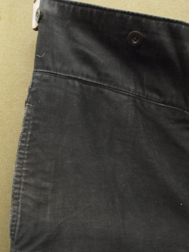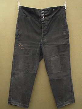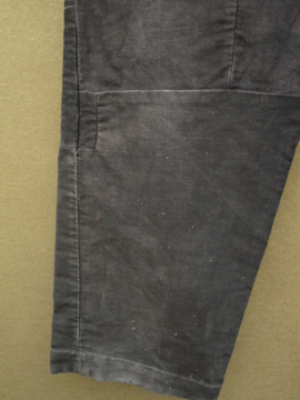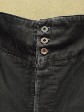 1930年頃につくられたブラックモールスキンのワークパンツ。コットン素材です。フロントに3連ボタンのついた太いウエストラインが良いです。ウエスト周りにはサスペンダー用のボタン、フロントはボタンフライ。バックにストラップがついていたようですがなくなっています。ポケットは左右の2つ、ボタンは樹脂とメタルのものがついています。大切に使用されていたようでパッチや手縫いの直し痕などが多く見られます。使い込まれた布地の風合いもまた魅力的です。全体的に直し痕、擦れ、汚れ、小さな穴など経年の痛みがあります。かなり使用感がありますので、ダメージを気にされない方、直しながら着用いただける方にお勧めです。