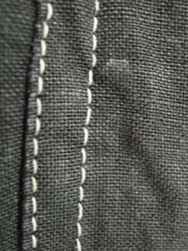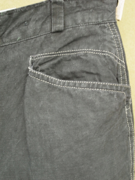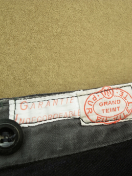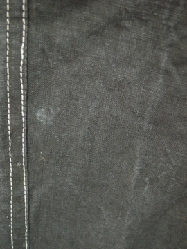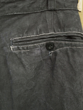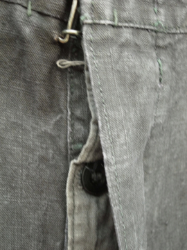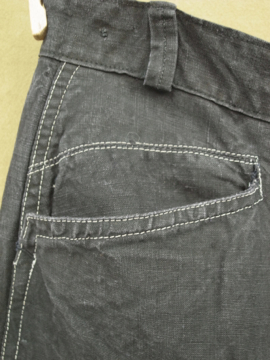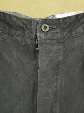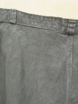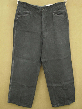 20世紀中期頃につくられたブラック・リネンのワークパンツ。薄手のとても質感の良い黒い布に白のステッチがアクセントになっています。ウエストにはベルトループ、内側にサスペンダー用ボタンがつき、フロントはボタンフライ。ポケットの形も良いです。白いステッチが切れてなくなっている部分、バックの股あたりに5mmほどの小さな穴があります。全体的にスレや色むらはありますが良い風合いです。