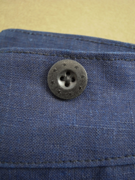 1930年代頃につくられたインディゴ染めリネンのワークパンツ。デッドストックです。深い藍の美しいハリのある良い布地。綺麗なシルエットです。ポケットは両サイドとウオッチポケット。バックについたストラップで多少のサイズ調節ができます。ウエストにはサスペンダー用ボタン、フロントはボタンフライ。星柄がプレスされたボタンは木製もしくはコロゾだと思われます。小さな白い汚れ(色抜け)がありますが、状態はとても良いです。初めて水通しする時に多少縮む可能性があります。