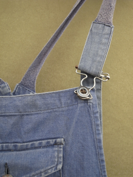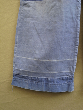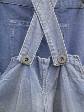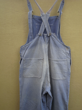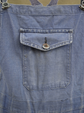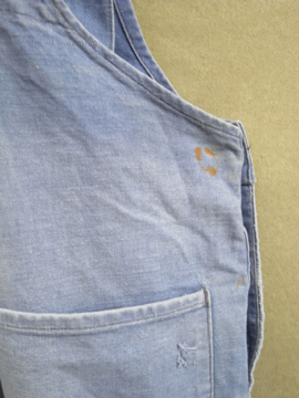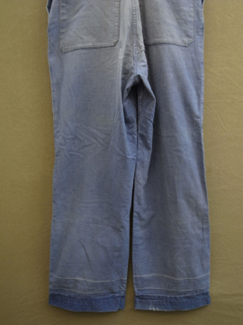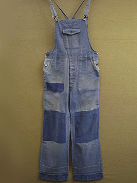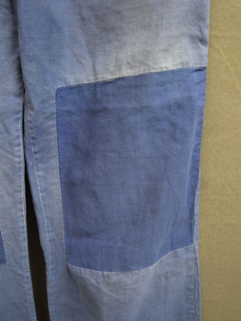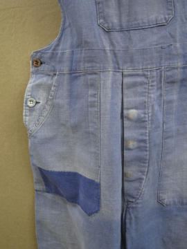 20世紀中期頃までにつくられたブルーのサロペット。当て布がされた直し、使い込まれたコットン素材は良い風合いです。胸当てのフラップポケットが可愛らしいです。ボタンはメタル製のものが多く使われていますが、錆が見られます。裾に布が継がれて丈が伸ばされています。全体的に直し痕や小さな穴、スレ、色ムラ、シミなどのダメージがあります。ダメージを気にされない方、直しながらご愛用いただける方にお勧めいたします。