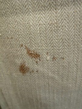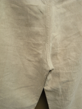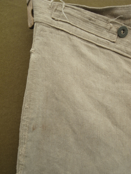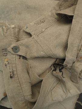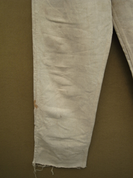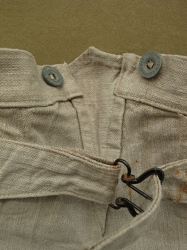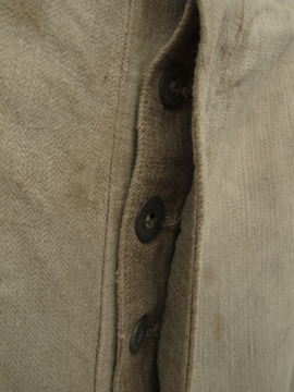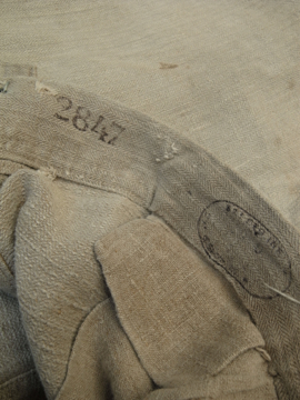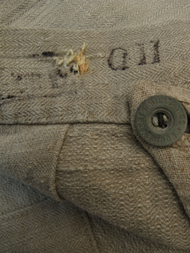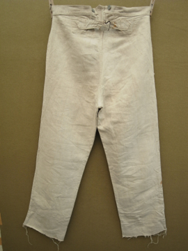 20世紀初期頃につくられたミリタリーのリネン・パンツ。ヘリンボーン織りのリネン素材は適度な厚さ、ハリやリネン特有の柔らかさを感じる良い素材感です。バックについたストラップでウエストサイズの調節ができます。ポケットはサイドとフロントのウォッチ用の計3個。フロントはボタンフライ、ボタンは全てメタル製です。ウエスト内側にスタンプが押してあります。ウエストまわりについたサスペンダーボタンは2個欠けています。全体的に染み、ポケットまわりに擦れ、裾が切りっぱなしになっている等の使用感があります。風合いが良く、なかなか見つかりにくい品なので古いものが好きな方にお勧めです。