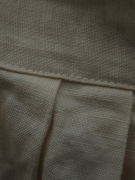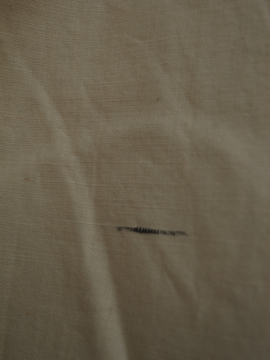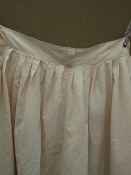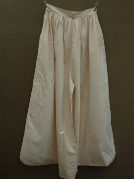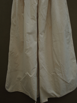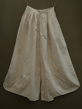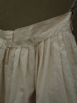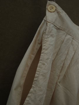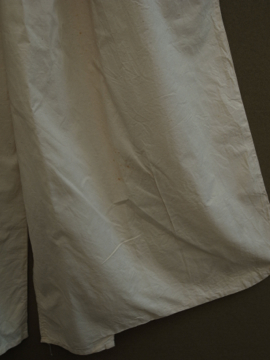 シーチングのような生成りのコットン素材でつくられた個性的なシルエットのパンツ。1930年代頃につくられたものだと思います。ズアーブパンツのようですが、とある城から出たものと聞いています。ウエスト右部分をボタン留めで着脱しますが、その部分がポケットも兼ねています。ボタンはボーン製、ボタンホールは手縫い。ウエストラインにはベルトループがつき、その下には前後ともに全面にタックが入り裾に向かって広がります。裾近くの一番広い部分の幅は左右各50cm程、非常にボリュームがあります。少しシミが見られますが、おそらく未使用品で状態はとても良いです。