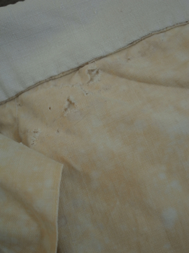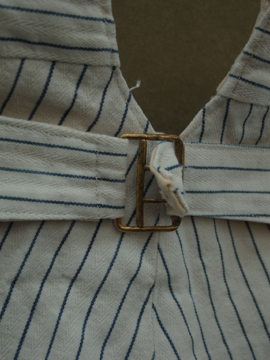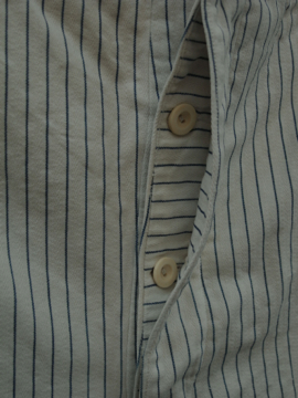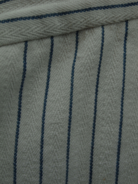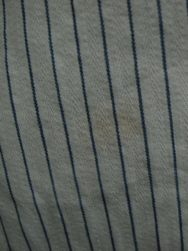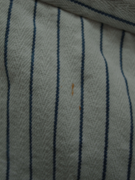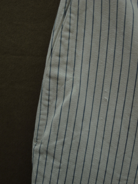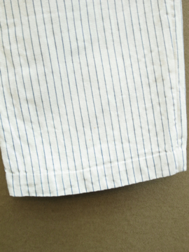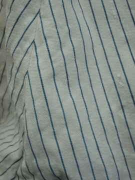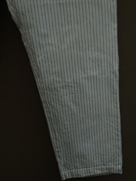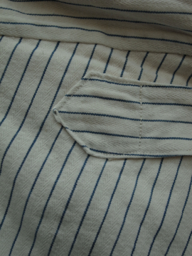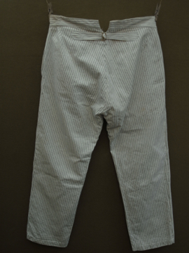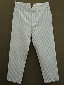20世紀初期頃につくられたストライプ・パンツ。インディゴ染めの青いストライプの間に織り柄の入った美しい布地で、比較的薄手で涼しいです。バックについたストラップで多少のサイズ調節ができます。ボタンはボーン製。あまり着用されていないようです。小さなシミやスレ、薄いシミ、裏地に傷みがありますが、年代を考えると状態はとても良いです。