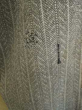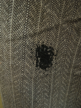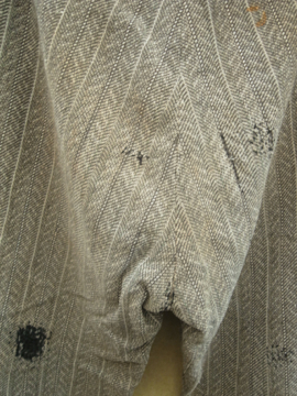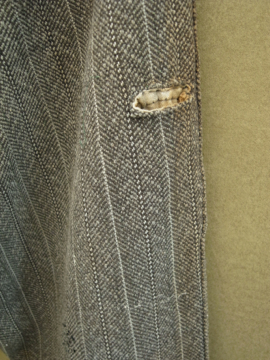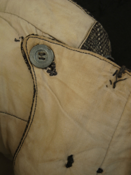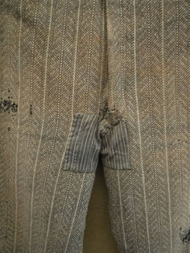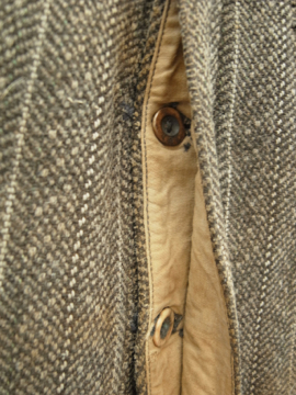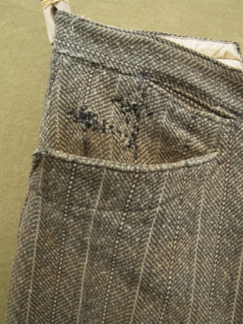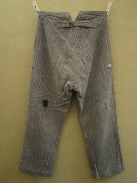 20世紀初期頃につくられたウール・ワークパンツ。ヘリンボーン織りの中厚手の良いウール地が使用されています。ポケットはサイドとウォッチ用、右下のハンマー用の計4個で、形や風合い共にとても良いです。バックストラップでウエストサイズを小さく調節もできます。フロントはボタンフライ、トップはホック留めです。ボタンはボーン製で、ボタンホールは丁寧な手縫い。全体的に手縫いの直し痕、パッチワーク、擦れ、シミなどかなりの使用感があります、短めの着丈なのでブーツなどにも合うと思います。時代を感じる、とても良い雰囲気を持った品です。
