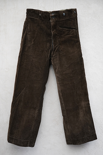 1930年代頃までにつくられたワークパンツ。ダーク・ブラウンの太畝コーデュロイ素材、使用感はなく未使用品だと思います。一度洗濯しています。面白いのは左前についたポケット。パンツが完成した後に特別な仕様として追加されたようで、珍しいです。ポケットは両玉縁でステッチも入れられたとても丁寧なつくりです。右側には通常通りのポケットが残っていますが口は縫い留められて使えなくなっています。フロントはボタンフライ、トップは2連のボタン留め、ウエストラインにサスペンダー用ボタン、バックシンチ付き。右前にはウオッチポケットもついています。 裾後ろ内側にはレザーの補強付き。味のある刺繍タグ。目立ったダメージはなく状態は良いです。かなりイレギュラーな一本です。