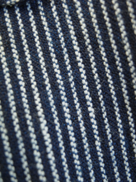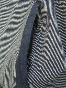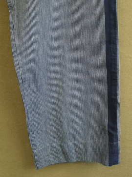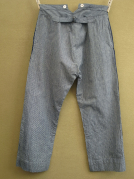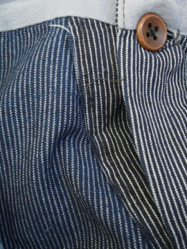 ストライプ織り柄インディゴ・ファイヤーマン・パンツ。1930年代頃までにつくられたものだと思います。比較的薄めのコットン素材です。ポケットは両サイドのみ、フロントはボタンフライ、ボタンはボーン製の様々なものがついています。バックについたストラップで多少のサイズ調節ができます。左の膝裏あたりに約1cm程の穴、穴の周りに少し錆染みがあります。その他は目立ったダメージは無く状態はとても良いです。