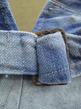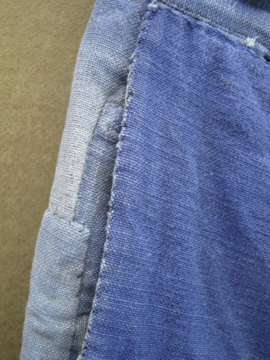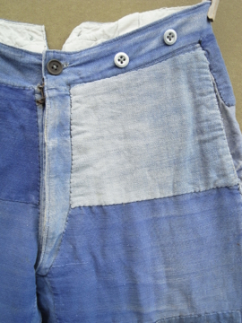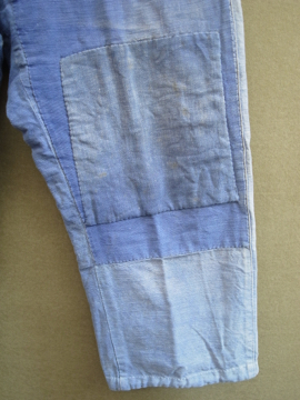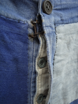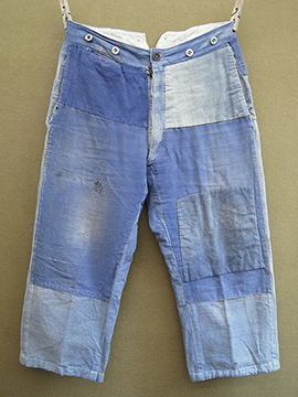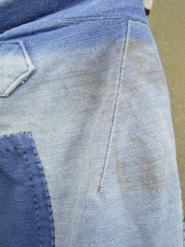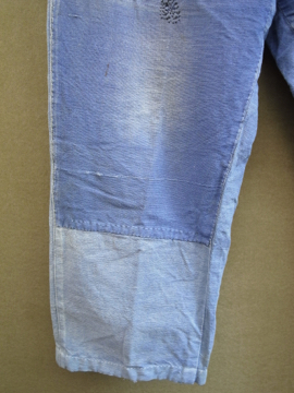 1930年代頃につくられたワークパンツ。リネンとコットンの混合素材。使い込まれ様々な布が継がれてとても味があります。フロントはボタンフライ、ウエストラインにサスペンダー用ボタン、バックにストラップ。手縫いの直し痕、金具に錆び、シミがあります。ダメージを気にされない方、直しながらご愛用頂ける方にお勧めします。
