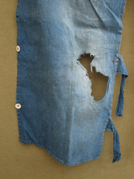 20世紀初期頃につくられた脚用エプロン。インディゴ染めのリネン素材、コットン混かなと思います。ボタンはボーン製、ボタンホールは手縫い。ウエストの紐が切れて無くなっています。膝部分に大きな穴がありますが、ぜひ布を継当てして使っていただきたいです。また、このようなものは大変珍しく資料的価値も高いと思います。 ほつれや汚れ、破れなどの経年の傷みがあります。