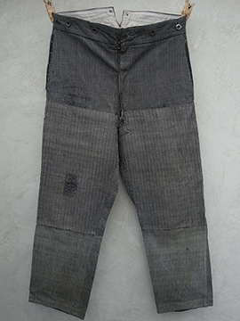 1930年代頃につくられたストライプ織柄コットンのワークパンツ。両脚に別布が当てられ、全体的にダーニングによる直しがされ、とても良い表情になっています。バックが高くなったウエストラインにサスペンダー用ボタン、バックシンチ、フロントはボタンフライ。ボタンはボーンやパピエマシェ等、風合いの良いものがついています。細めのシルエットです。小さい穴や擦れ、ほつれ、シミや色むら等の使用感がありますが、とても良い雰囲気がある一本です。ダメージを気にされない方、直しながらご愛用いただける方にお勧めします。