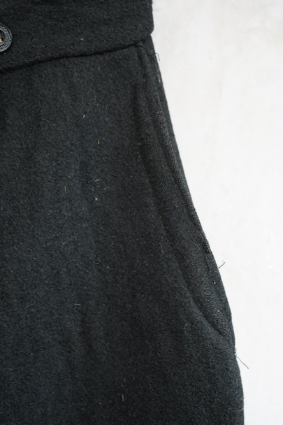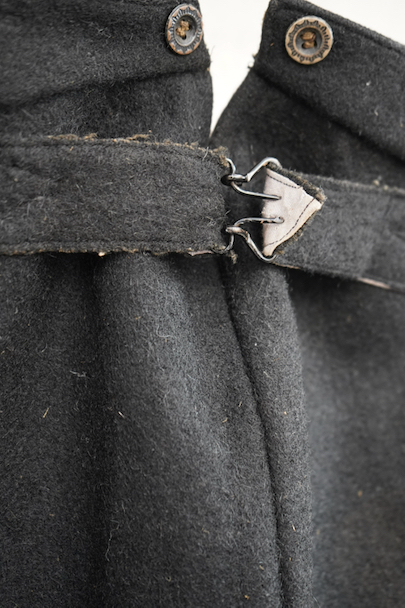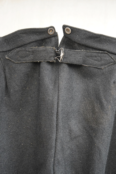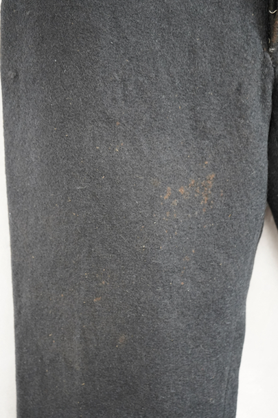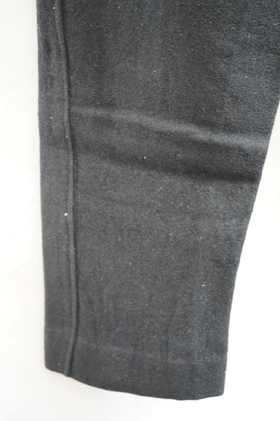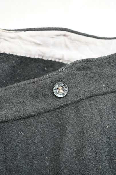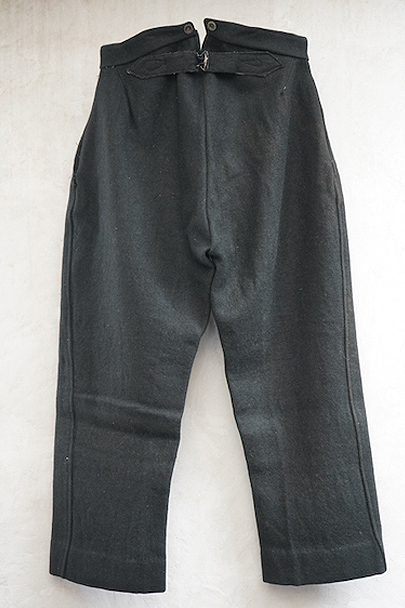 20世紀初期頃につくられたワークパンツ。とても風合いの良い厚手のウール素材です。ウエストラインのバックが高く、全体的なシルエットも綺麗です。フロントはボタンフライ、ウエストラインにサスペンダー用ボタン、バックシンチ。ボタンはパピエマシェ製がついています。ボタンホールは手縫い。布地はしっかりとしていますが、全体的にシミ(色抜け?)による色むらが見られます。ウエストサイズはバックシンチを外した状態で84cm、バックシンチを繋いだ際は約76〜81cmです。