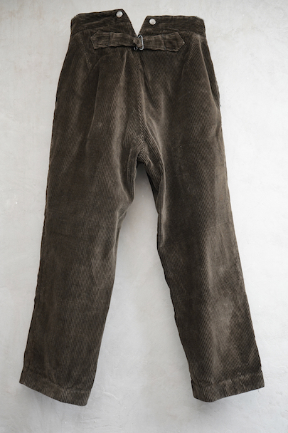 1930年代頃につくられたダークブラウンのコーデュロイ・ワークパンツ。デッドストックを一度洗濯しています。太畝のコットン・コーデュロイ素材、フロント・トップは2連のボタン留めの広めのウエストライン。フロントはボタンフライ。バックシンチ付き。裾内側にレザーの補強、ステッチ入りのポケット、ごま塩のポケットの内袋など、つくりの良いパンツですが、ウエストラインのバックが揃っていないのがご愛嬌です。ボタンはメタル製です。金具や打ち込みボタンにサビがあり、裏地にサビ染みや穴があります。表は目立ったダメージはなく状態が良いです。