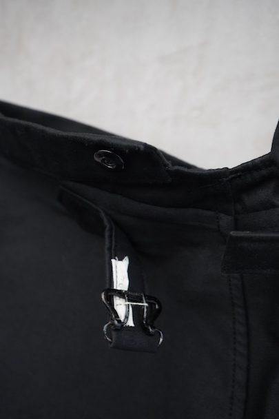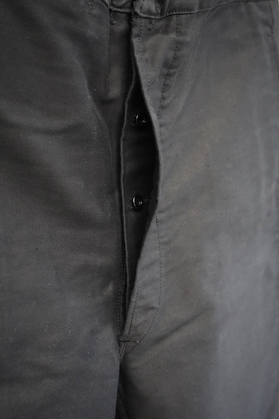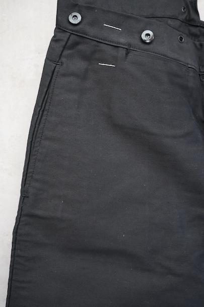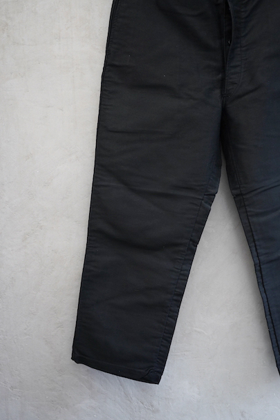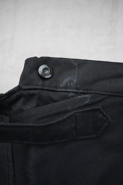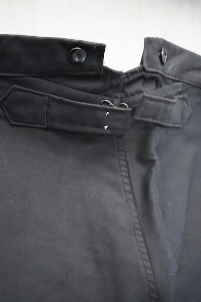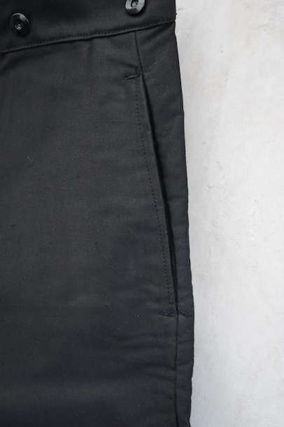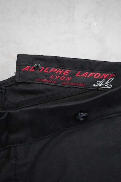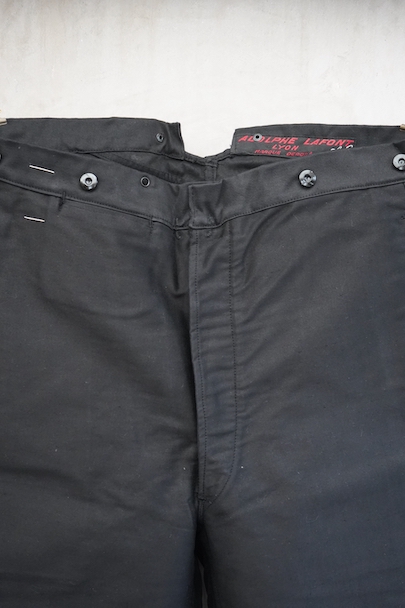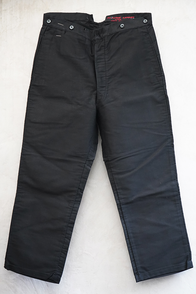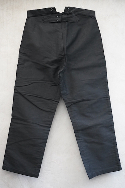 1930年代頃につくられたブラック・モールスキン・ワークパンツ。リヨンのワークウエア老舗の”Adolphe Lafont”製、デッドストックです。ウエストラインにサスペンダー用ボタン、バックが高くなったウエストライン、ストレート・タイプです。フロントはボタンフライ、ポケットは左右とウオッチ用があります。ボタンは打ち込みのメタル。保管中についた薄い白いシミがバック上部にありますが、全体的な状態はとても良いです。初めて水通しする際に多少縮む可能性があります。