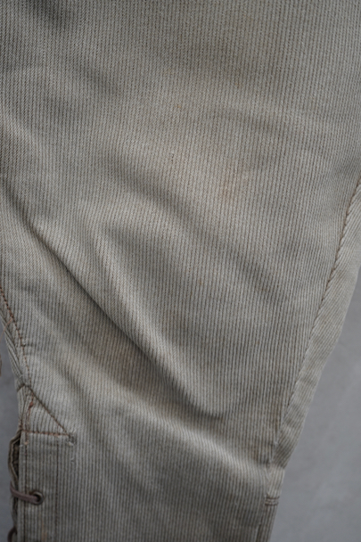1940年代頃につくられたベージュのコットン・ピケ素材のジョッパーズ。Le Mont St Michel製、刺繍タグがついています。フロントはボタンフライ、ウエストラインにベルトループ、裾から25cmレースアップです。フロント左右にに両玉縁ポケット、ウオッチポケットもついています。右バックにはボタン留めのポケット。ポケット周辺などに黄ばみ、膝周辺に擦れた傷があります。その他、全体的に薄いシミや擦れがあります。小さめサイズで女性にお勧めです。