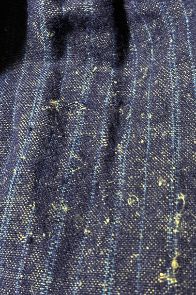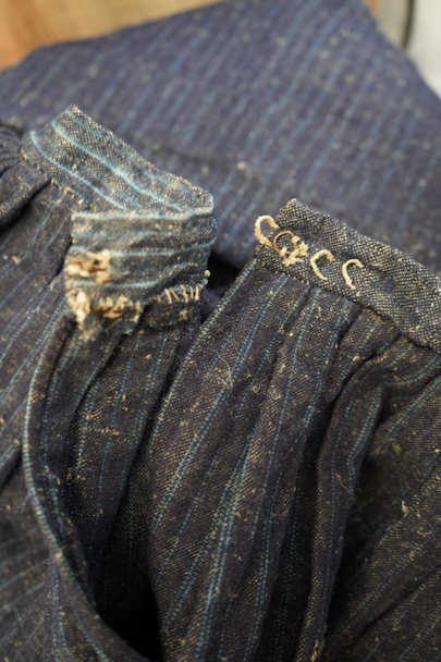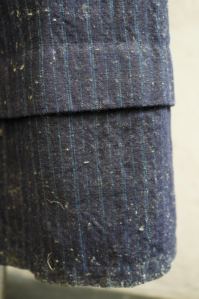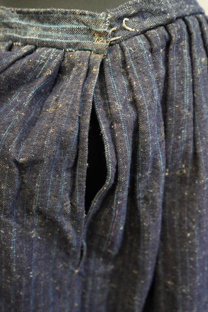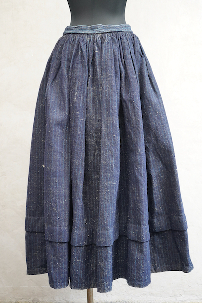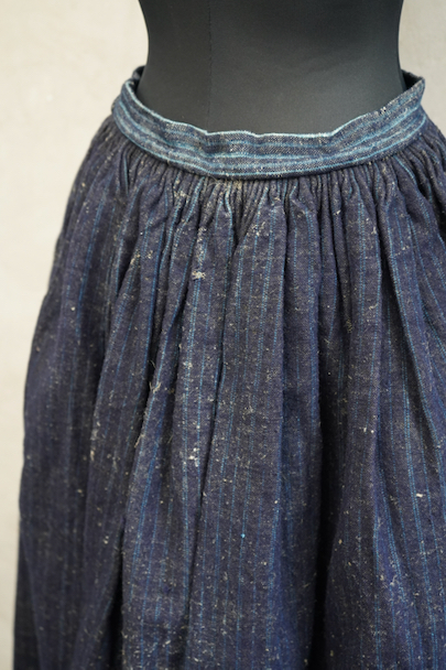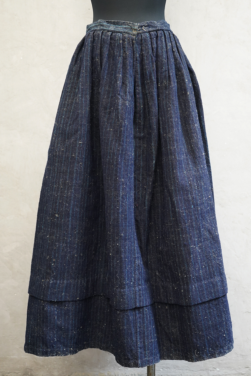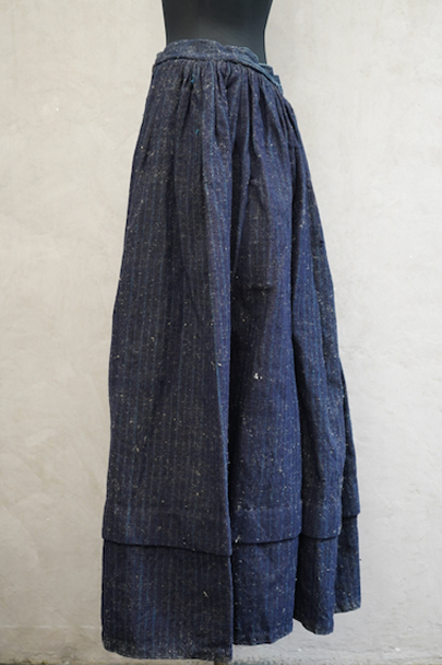 19世紀につくられたストライプ織りのdroguetスカート。重厚なリネン・ウール地で、深みのあるインディゴ染めです。ウエストラインにギャザーが沢山入り、ボリューム感のでるシルエット。ウエストをホックで留める仕様で、受け部分がいくつかあるので、若干ウエストサイズを小さくできます。ホック下は25cm開きがあります。全体的にネップのようなもの、穴や擦れが多数あります。