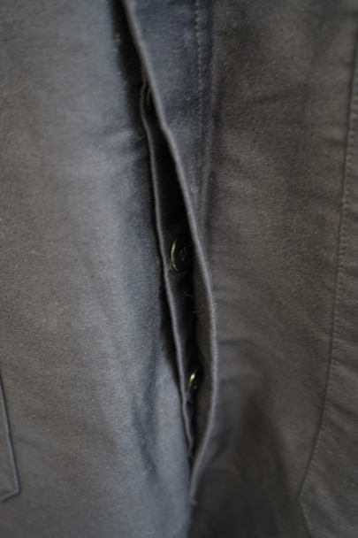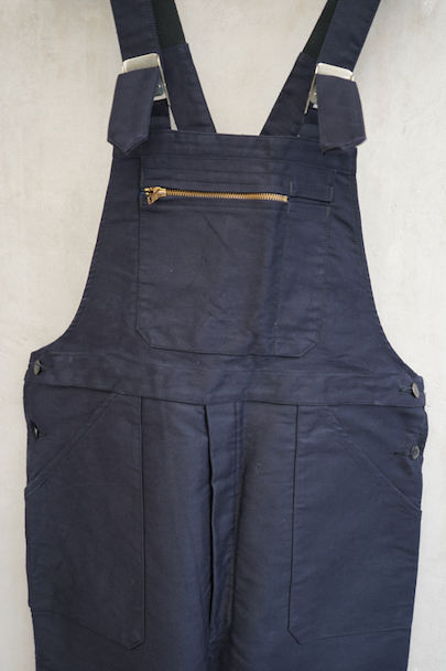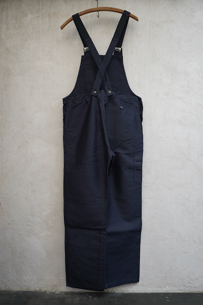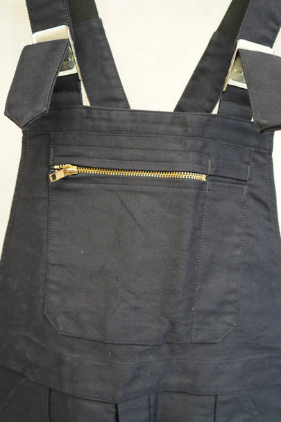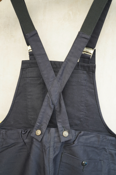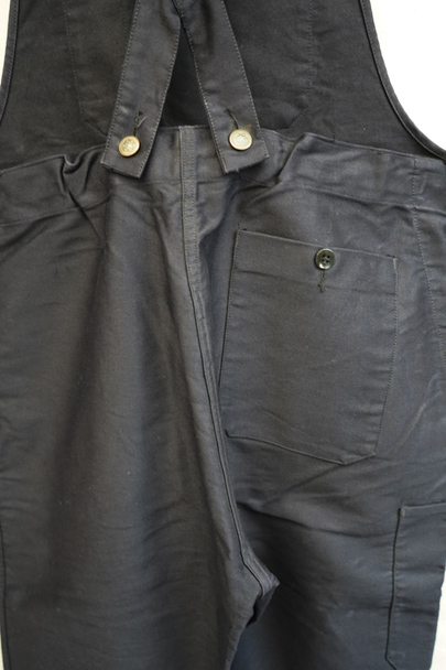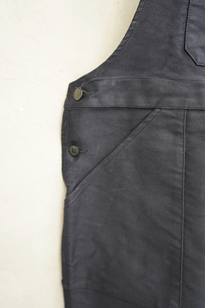 20世紀中期頃につくられたブラック・モールスキンのサロペット。デッドストックです。胸当てにYKKファスナー付きの大きなポケットとペン差し、バックのポケットはボタン留め、右サイドにハンマーポケットもあります。フロントはボタンフライ。若干の汚れはありますが、状態はとても良いです。