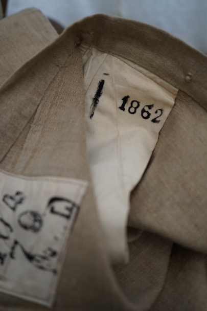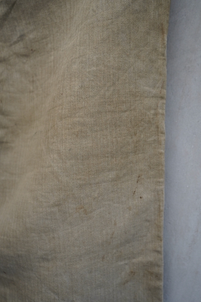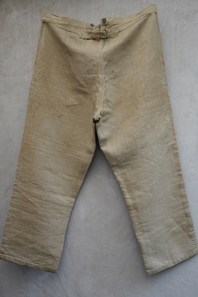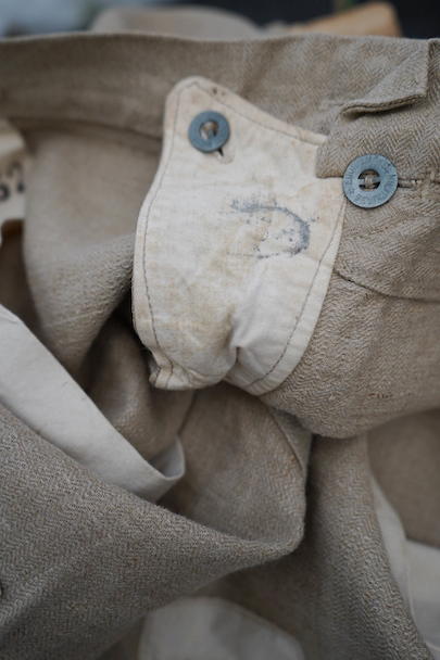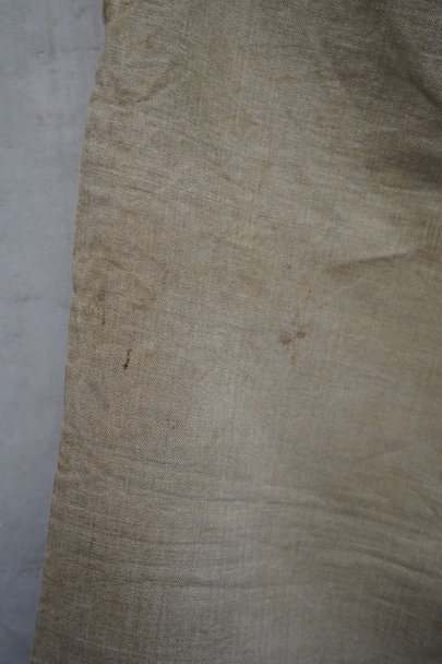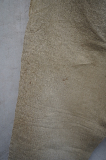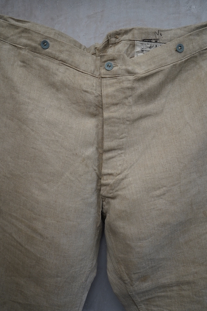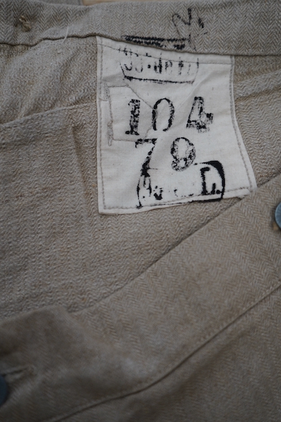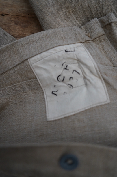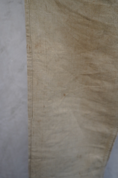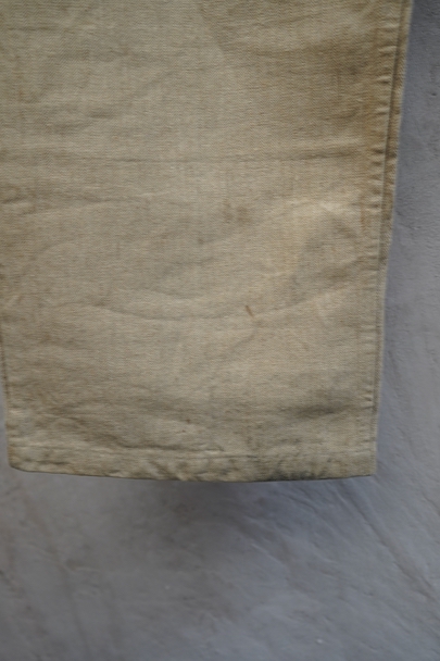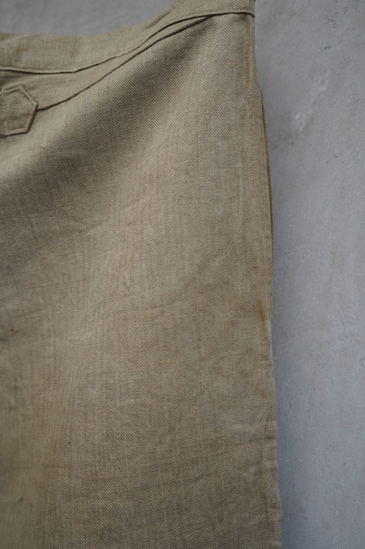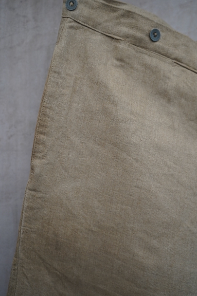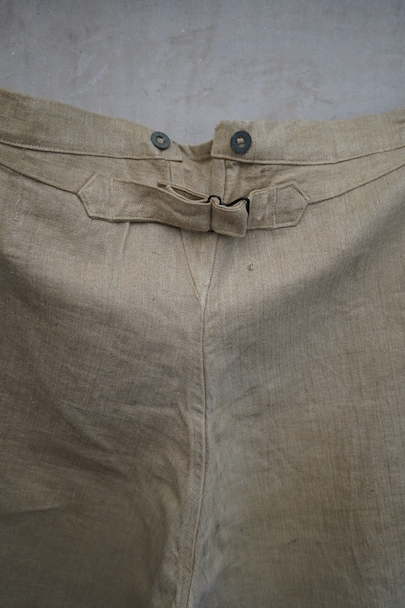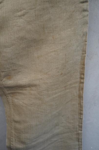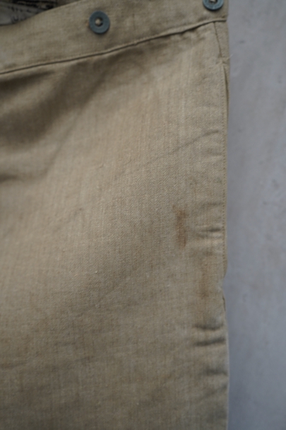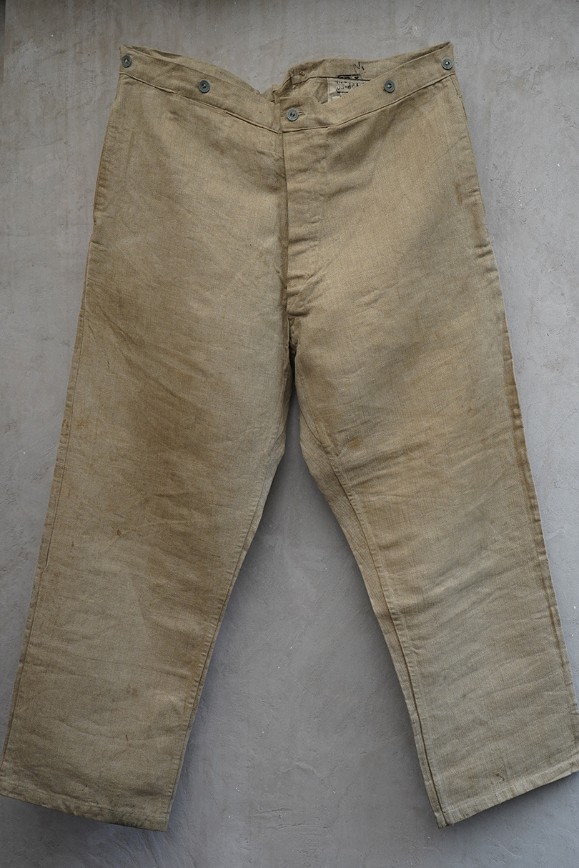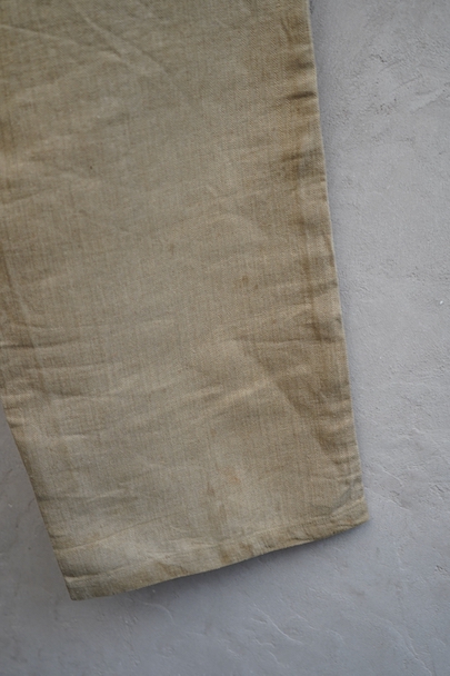 1930年代頃につくられたフランス軍のワークパンツ。ヘリンボーン織りの生成りリネン素材です。フロントはボタンフライ、古いタイプの合わせです。内側にスタンプ有り。ウエストラインにサスペンダー用ボタン。バックシンチで一番絞った状態のウエストは約103cmです。ボタンはEQUIPEMENT MILITAIRESと記されたジンク製。使用感は少なく布地の状態は良いですが、全体的にシミや汚れがあります。