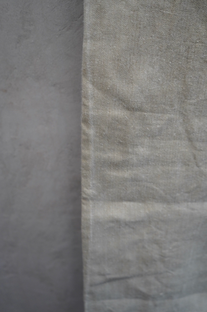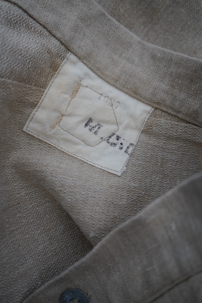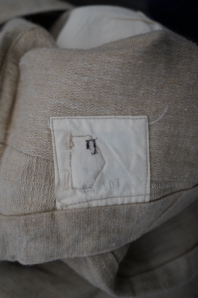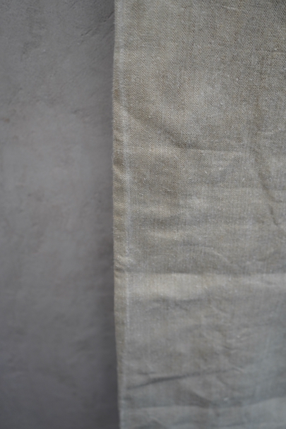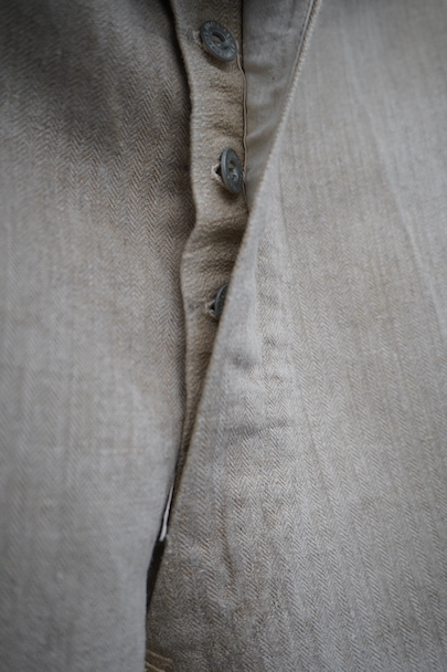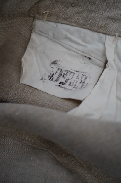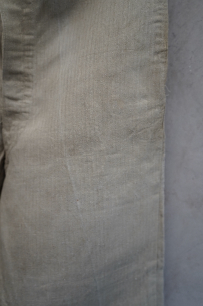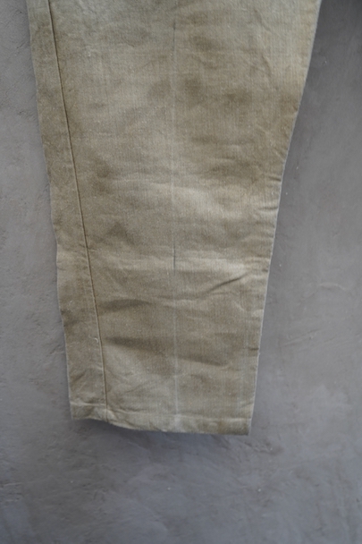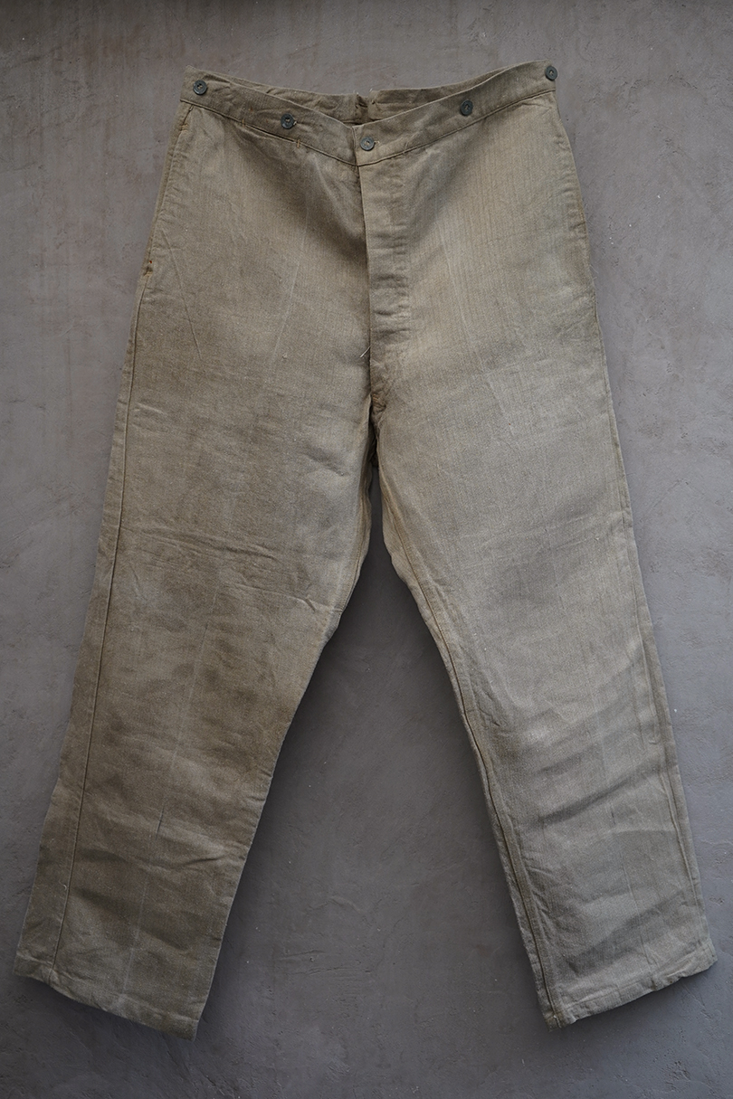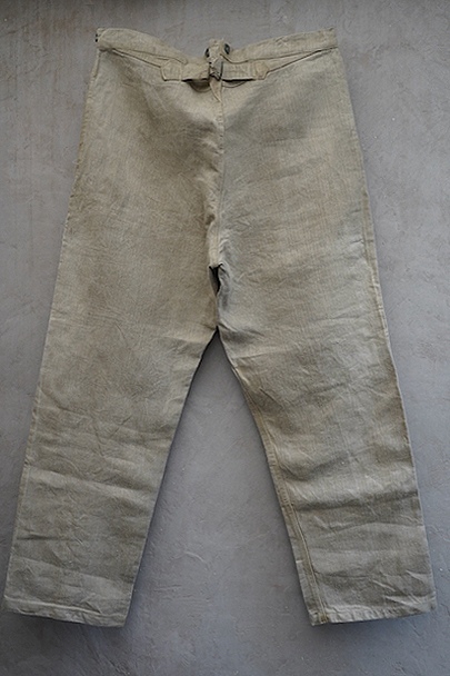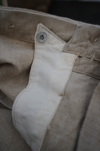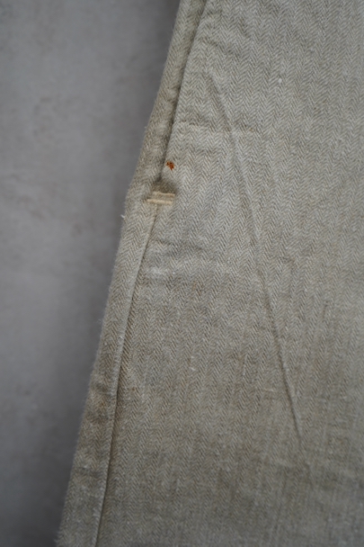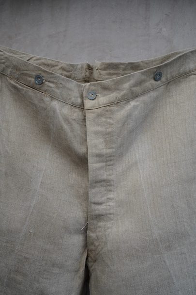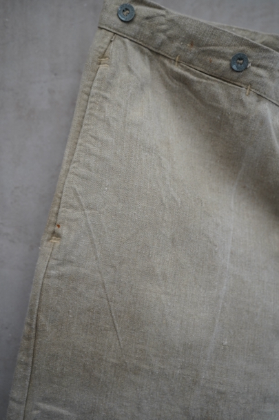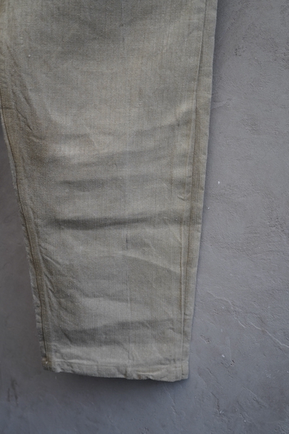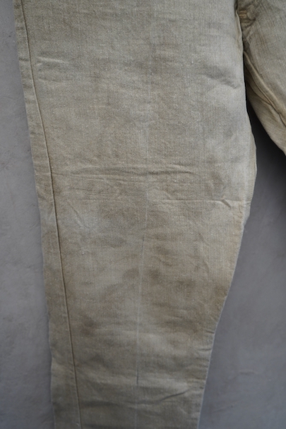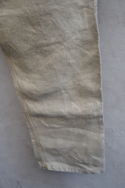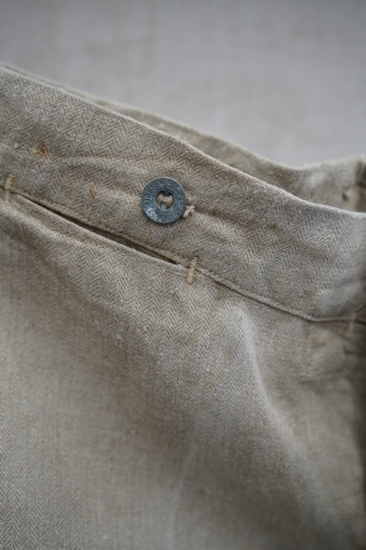 1930年代頃につくられたフランス軍のワークパンツ。ヘリンボーン織りの生成りリネン素材です。フロントはボタンフライ、古いタイプの合わせです。内側にスタンプ有り。ウエストラインにサスペンダー用ボタン。左右のポケットの口の上下には2重の閂が入っています。ボタンはEQUIPEMENT MILITAIRESと記されたアルミ製。バックシンチで一番絞った状態のウエストは約92cmです。布地はしっかりとしていますが、全体的にシミや汚れがあります。