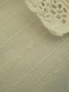 ストライプ柄に織られたコットン素材のケープ。1910年から1930年代頃につくられたものだと思います。レースがついた大きな襟、丸みのある裾の形が面白い品です。フリーサイズ。裏が少し起毛した素材です。ボタンは貝製、ボタンホールは手縫いで、とても丁寧なつくりです。裾についたレース部分に0.1cmから0.5cmの穴、0.5cmから2.5cmの直し痕、小さなシミやスレ、ほつれ等、経年の傷みがあります。