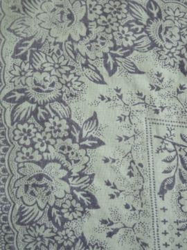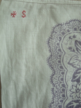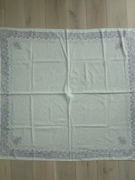 20世紀中期頃までにつくられた大判のコットン・スカーフ。花柄の縁、内側は十字や円の幾何学模様が薄い紫色でプリントされています。角に赤い手縫いのイニシャル刺繍が施されています。中央部分に刺繍のような細かく美しい直し痕があり、その横に1cmの穴があります。その他、色の濃淡や小さな穴や直し痕等の経年の傷みがあります。