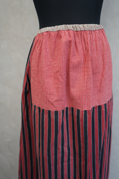20世紀初期頃につくられたロングスカート。コットン素材です。赤と黒をベースに、インディゴストライプが差し色になってよい色合いの布地、一部赤チェックの布地パッチワークされています。ウエストラインには紐が通っているため、サイズ調節が可能です。裾の内側の着用時見えない部分に直し痕や擦れや裂け、穴があります。その他、手縫いの直し痕、小さな穴、擦れ、糸のほつれなど全体的に経年の傷みがあります。着用に問題ない程度ですが、ダメージを気にされない方にお勧めです。