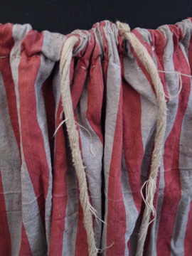 1900年代頃につくられたストライプ・ロングスカート。目の詰まったハリのあるコットン素材で、くすんだ色目が古く良い風合いの素敵な布地です。ウエストのサイドからバックにかけて通った紐でウエストのサイズ調節ができます。紐を絞るとバックにギャザーが入り独特の綺麗なシルエットになります。紐にスレやほつれが見られます。全体的に汚れやシミ、スレ、直し、小さな穴やほつれ等、経年の傷みがありますが、着用に問題ない程度で良い味となっています。布地はしっかりしているのでまだまだ長くご愛用いただけると思います。とても存在感のある品です。