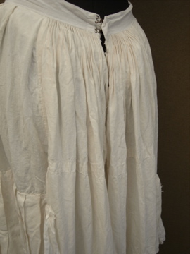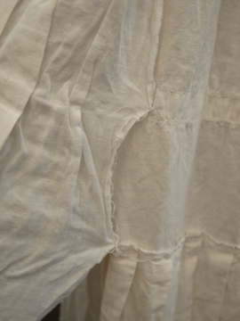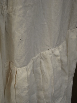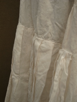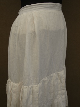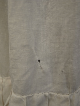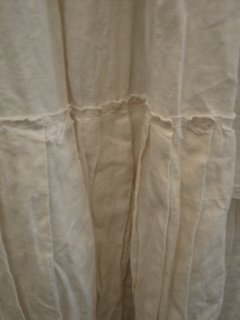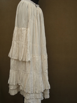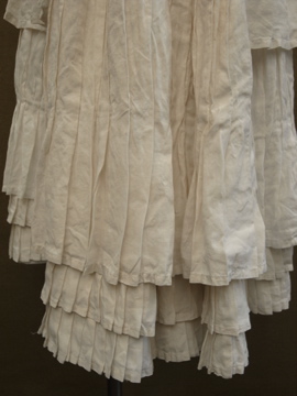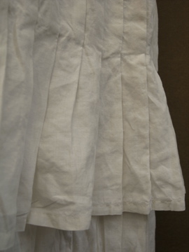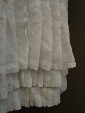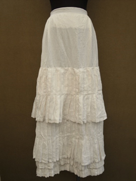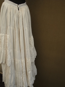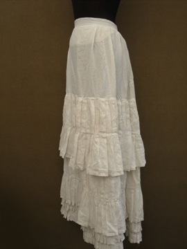 19世紀後期から20世紀初期頃につくられたロングスカート。元々はアンダースカートですが、目の詰まった薄手のリネン生地を贅沢に使った非常に美しい品で、下にペチコートなどを着用してぜひスカートとして使っていただければと思います。ウエストのバックのホック下あたりに細かくギャザーが入っています。プリーツの入ったフリルが4段ついていますが、ボリュームが出すぎずとても綺麗なシルエットです。バックの腰からヒップにかけてバッスルをつけるために一段目のフリルはバック部分がないのが興味深いです。小さなシミが数カ所あり、直し痕、糸のほつれ、0.1cmから0.5cmの穴がある等、経年の傷みがあります。アンティークの布地の風合い、シルエットの美しさ、素晴らしい品です。