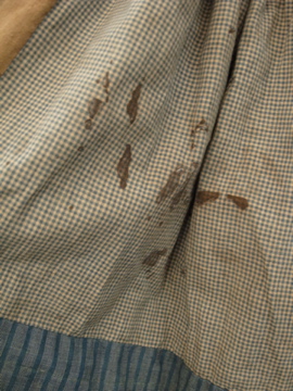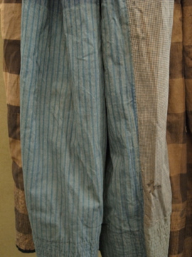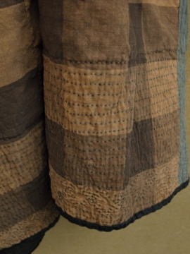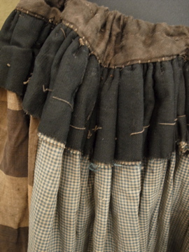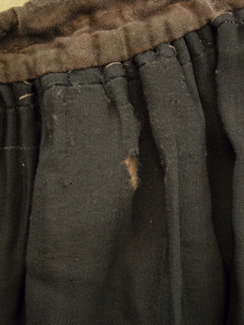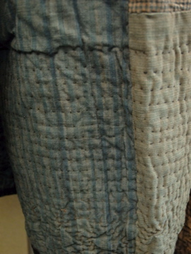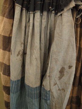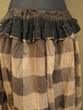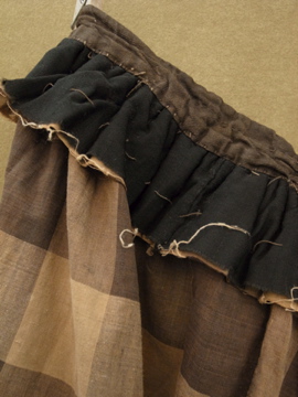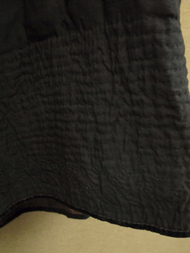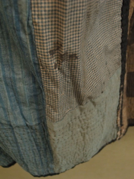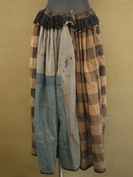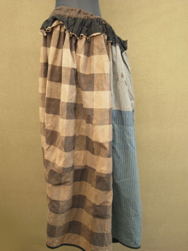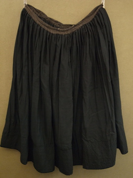 19世紀にフランスでつくられたキルティングスカート。黒いウール地が表ですが、裏地のパッチワークが美しいので、裏表で着るのをお勧めします。パッチはインディゴ染めの糸が使われた布地など、とても良い風合いの素材が使われています。黒の表地は薄手のウールとコットン素材で、裾部分には手縫いのステッチが施されたキルティング状になっています。表裏共に、汚れやスレ、穴など、多数の傷みがありますが時代を感じさせ存在感があります。ウエスト周りに紐が入っているためサイズはフリーです。かなりの傷みがありますが着用には問題ない程度ですので、ダメージを気にされない方に手直しをしながらぜひ実用していただきたい品です。とても古いものですので、取り扱いにはご注意ください。