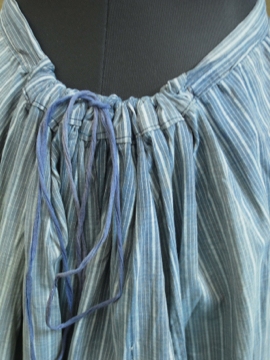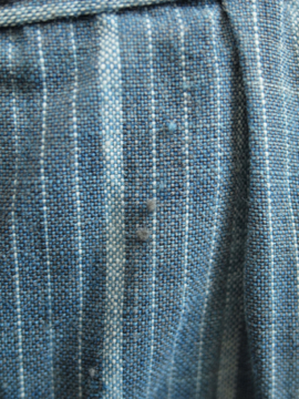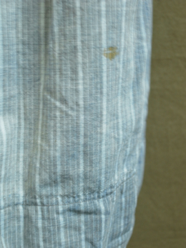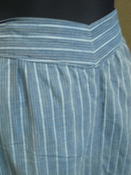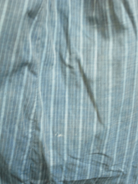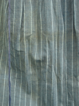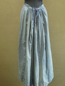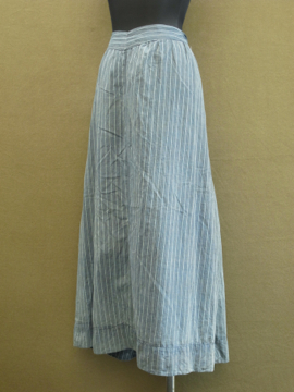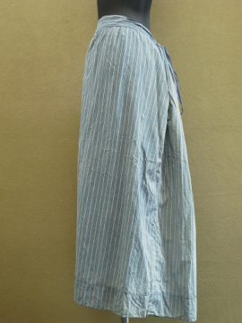 1900年代頃につくられたインディゴ染めストライプのロングスカート。比較的薄手のコットン素材です。褪せて落ち着いた色目が綺麗です。ウエストのバックに入った紐で絞って着用するためフリーサイズです。絞った際にギャザーがよって後ろ下がりになるシルエットが綺麗です。1cmの穴が3箇所、大小のシミや黄ばみがあります。多少の傷みはありますがとても良い雰囲気を持った品です。