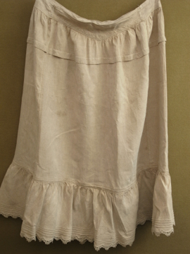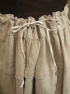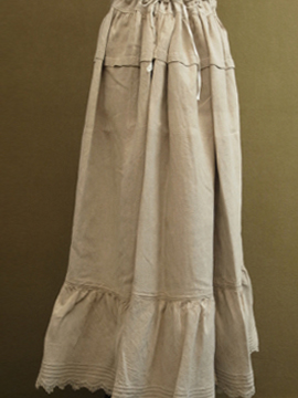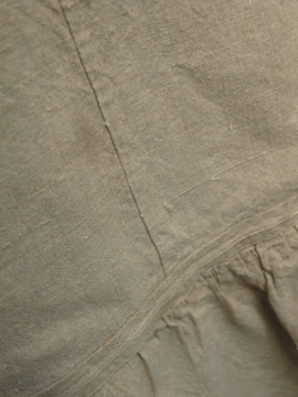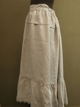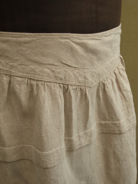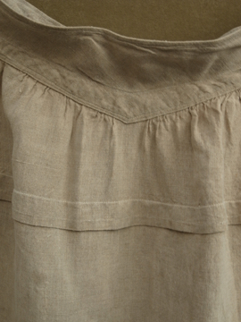 20世紀初期頃につくられたリネンスカート。目が詰まりハリと滑らかさを兼ね備えた良い質感のリネン地がたっぷりと使用されています。ウエストラインバックに紐が入っているので、絞ることによりフリーサイズでご着用いただけます。シンプルな中にもタックやレースなど細部へのこだわりが見えます。染みや汚れ、日焼けによる色むら等多少の傷みはありますが、目立ったダメージは無く生地もしっかりしているので、時代を考えると状態は良いと思います。古い品の傷みに理解のある方にお勧めします。