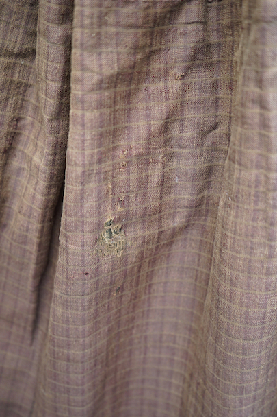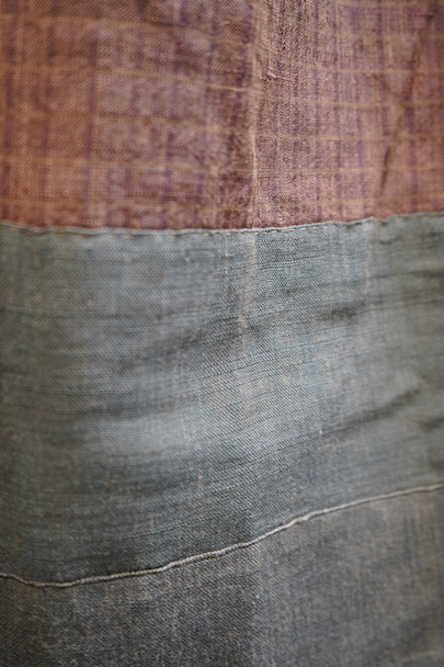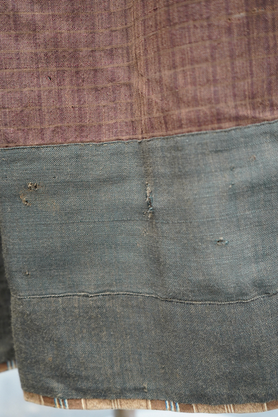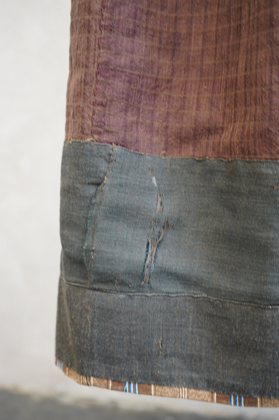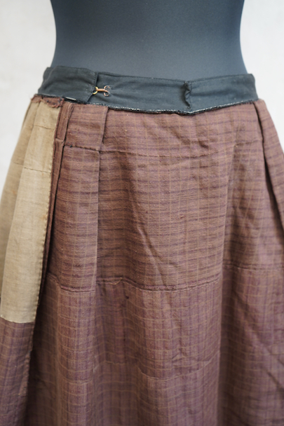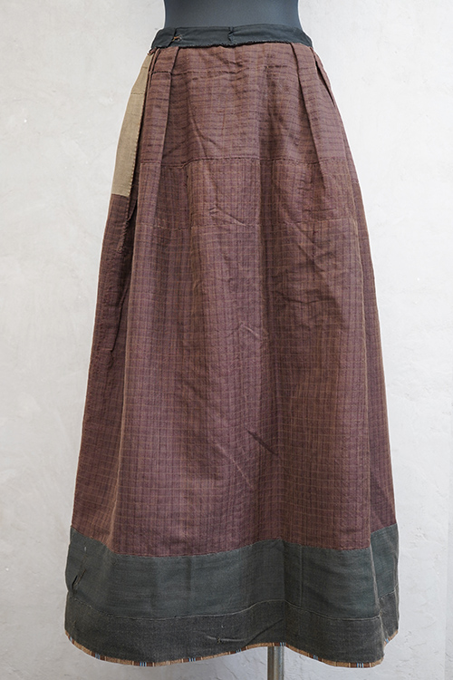 20世紀初期頃までにつくられたロングスカート。アンティークのウールリネンのミックス生地と、ストライプ織りのコットン生地が使用されています。裏地がパッチワークのようになっているのでリバーシブルで楽しめます。全体的に手縫いの直し痕や擦れ、糸のほつれ、その他裏地に穴や裂け、擦れが多数あります。使用感はありますが、直しは丁寧で大切にされてきたことがわかります。アンティークのとても良い雰囲気を持った品なので、ダメージも味として楽しんでいただける方にお勧めです。ウエストはホック留め、ホック下が27cm開いています。