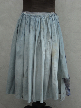 20世紀初期頃につくられたスカートの襤褸。インディゴ染めのコットン素材、様々な布が継がれ張られ、それがボロボロになっています。ウエストのバックに細かいプリーツが入り右サイドでホック留め、ホック下は裂けて開いた状態です。スカートの上に巻いたり、男性でもパンツの上に巻いたりと、エプロンを合わせる様に使えば面白いです。穴やシミ。破れなどの傷みがありますので、古いものに理解のある方にお勧めします。
