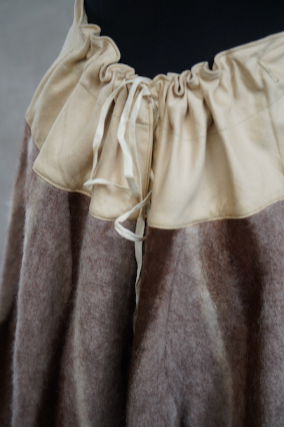 1930年代頃につくられたモヘア・スカート。紙タグ付きです。上部は光沢のあるコットン素材です。未使用品を一度洗濯しています。ウエストラインバックに紐が通っているのでウエストサイズが調節できます。元々アンダースカートとして使用された品の為、紐下は24cm開いています。縫い留めたりスナップボタンを付けると1枚でも使いやすいです。保管中にできた多少の擦れがありますが、状態は良いです。