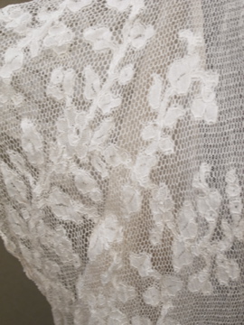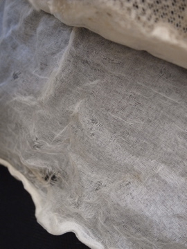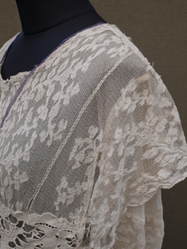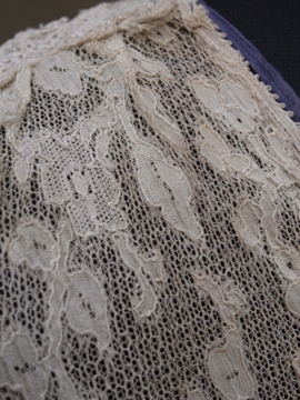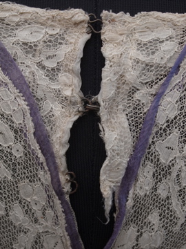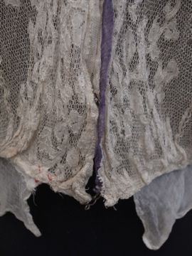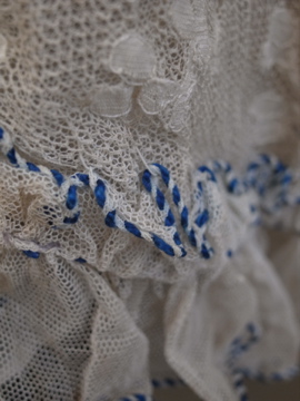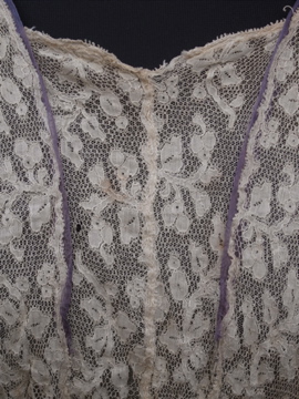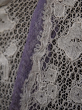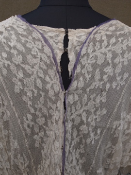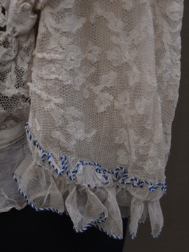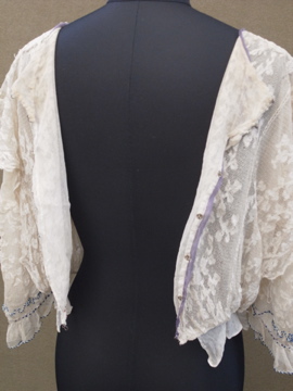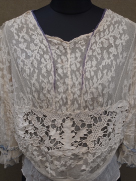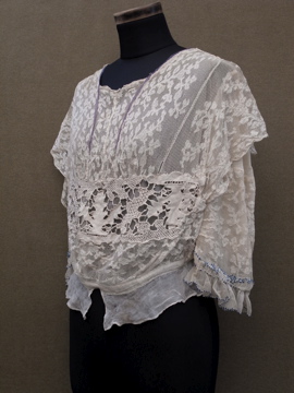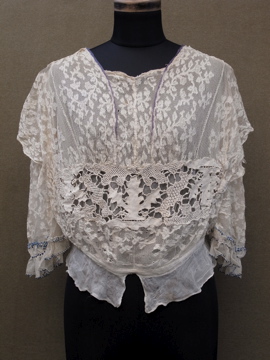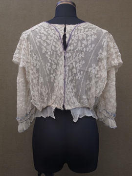 1900年代頃につくられたレースブラウス。袖口に入った青い刺繍が珍しく、バックのスナップまわりからフロント胸元にかけてつけられた褪せた紫色のシルクシフォンの飾りが綺麗です。身頃と袖部分はレースが二枚重ねになっています。裾にはシルクシフォンの柔らかな布地がついています。全体的に穴やシミなど経年の傷みがあります。特に裾部分のシフォン生地は繊細なので、取り扱いには十分ご注意ください。