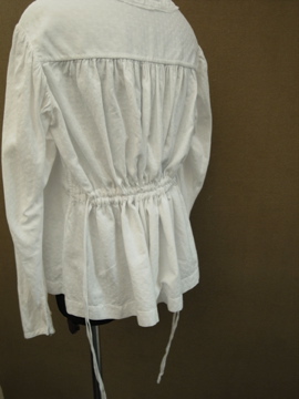 19世紀後期頃につくられたコットン・ブラウス。肩の落ちるシルエットや細く立体的につくられた袖、切り替えに入ったパイピングとギャザー等、ディテールにこだわりの見られる美しい品です。背中部分に紐が通った珍しいつくりのブラウスで、紐を絞ることによって表情が変わります。ボタンは貝製。ボタンホールにほつれ、両袖口近くに直しと小さな裂けと穴、袖口のボタンが一つガラス製になっています。襟のレース部分に穴があります。多少の傷みがありますが、年代にしては状態は良いです。