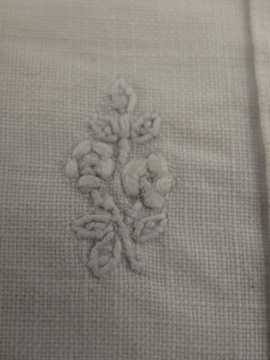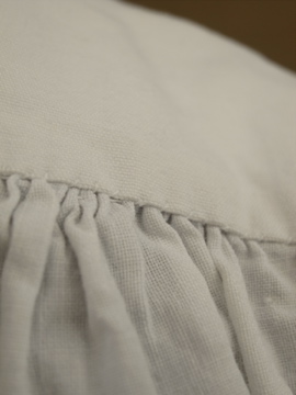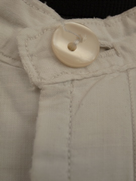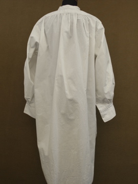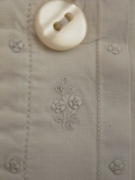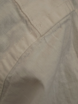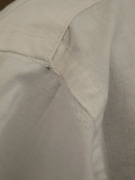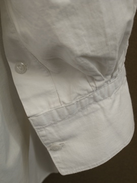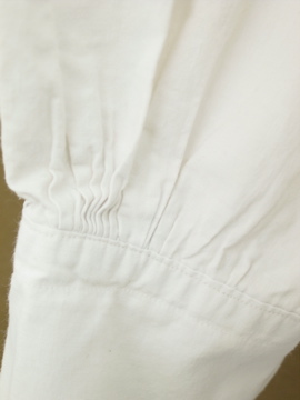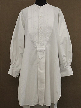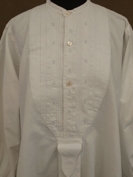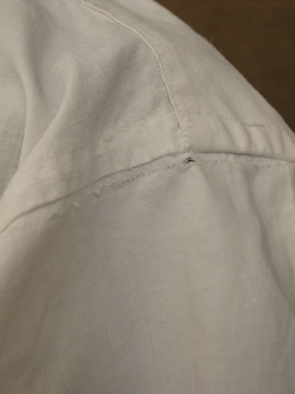 20世紀初期頃につくられたコットン・ドレスシャツ。フロント胸当て部分に細かいタックととても繊細な花刺繍が施されており、ウエディング用だと思います。こちらはサイズが小さめのため女性に良いと思います。バック右上に1cm程の線のようなシミがあります。アームホールを一度縫い直しているようで、元の縫い目が袖のついている部分から0.5cmくらい表に出ており部分的に0.2cmから0.3cmの穴となっています。その他、糸のほつれ等経年の傷みがあります。良い品物なのでダメージを気にされない方、袖の直しができる方にお勧めします。