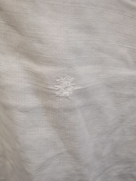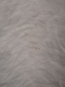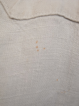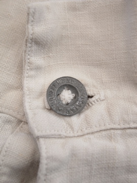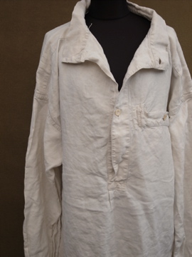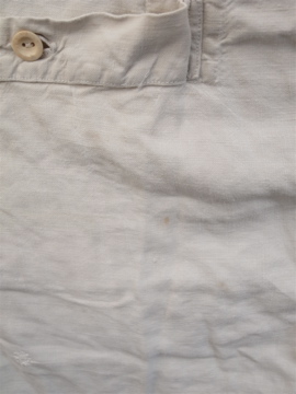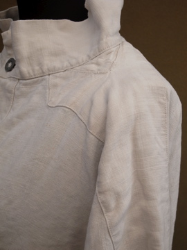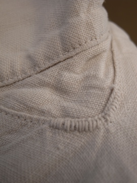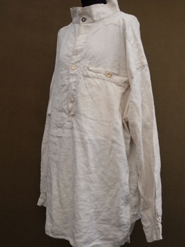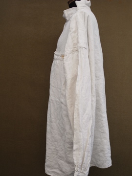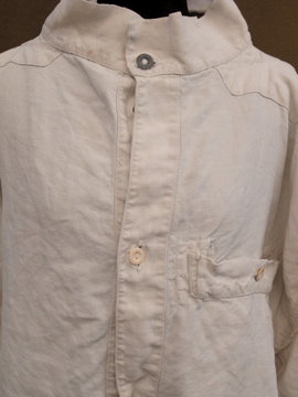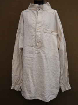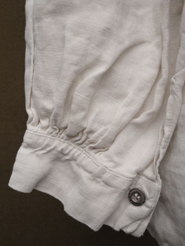 スタンドカラーのリネン・トップ。おそらく1910年代頃につくられたフランスのミリタリーのものです。薄手のリネン素材は使い込まれて柔らかさの出た良い質感です。肩に大きくついたY字のヨークや袖口の細かいギャザーなど細部のつくりも良いです。ボタンは骨やメタルなど部分的に素材が違うものに付け替わっているのですが、どれも良い風合いです。全体的に小さなシミなど経年の痛みがあります。サイズが大きめですが、てろっとした素材感なので肩を落としてオーバーサイズで着てもきれいです。