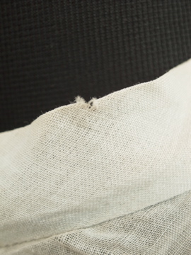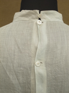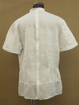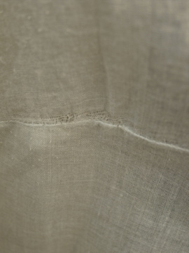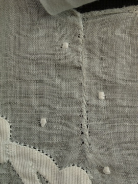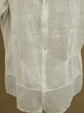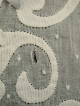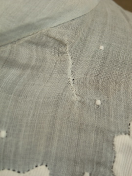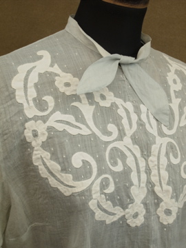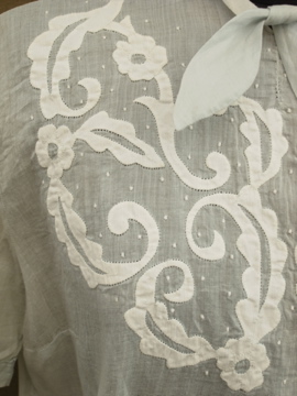 1910年から1920年代頃につくられたブラウス。ハリがある薄手の上品なコットン生地は淡いブルーの色と透ける柔らかな印象でとても美しいです。ネックにはリボン、フロントの上部に施された花模様は品があります。花模様の中心あたりに0.8cmの穴があります。フロント左のネックライン近くに2cmの直し痕、リボン下に4.5cmの直し痕があります。その他、小さな穴や糸のほつれがあります。傷みはありますが良い品ですので古いものがお好きな方にお勧めします。とても繊細なため取り扱いには十分ご注意ください。