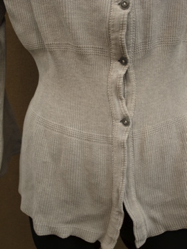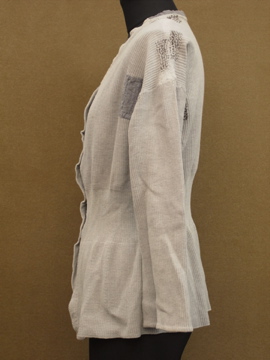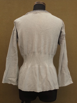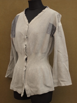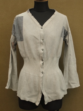 20世紀初期頃につくられたコットン・トップ。前開きで合わせやすく使いやすいです。ウエスト周りは編みが細かくなっていて身体にフィットする良いシルエットです。全体的にパッチされた直しや針で綺麗に直した痕がありますが、全て手作業でされています。フロントのボタンはガラス製。シミなどの経年の傷みもありますが、良い風合いの品です。