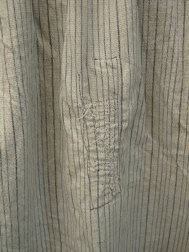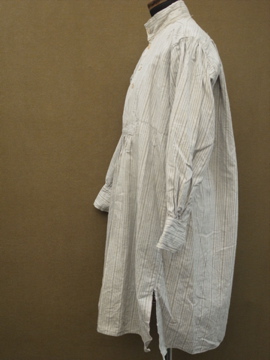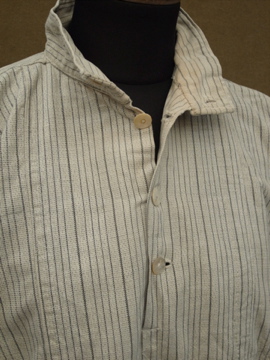 19世紀後期頃につくられたストライプのワーク・シャツ。フランス田舎の農家から出た品物です。厚手のしっかりとしたコットン素材で、良い風合いの布地です。珍しいスタンドカラーで、フロントの共布の胸当て、肩から脇にかけて二枚布で補強されたしっかりとしたつくりです。胸当ての下にはギャザーが入り可愛らしいです。袖口にスレ、サイドに入ったスリットに裂け、背中に大きめの直し痕があります。全体的に黄ばみがある等、使用感がありますので、古いものに慣れた方にお勧めいたします。