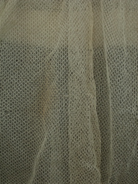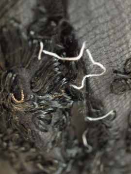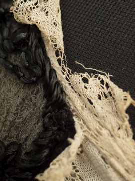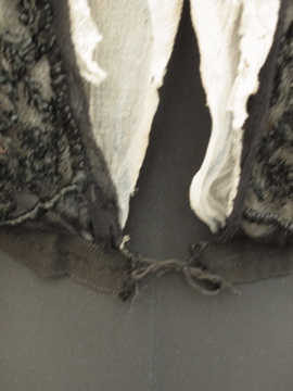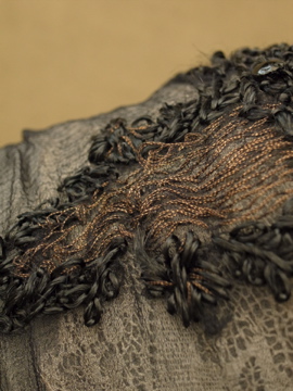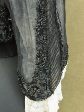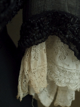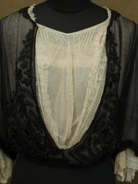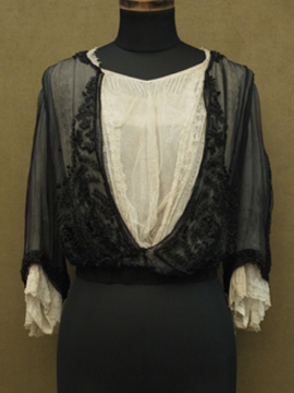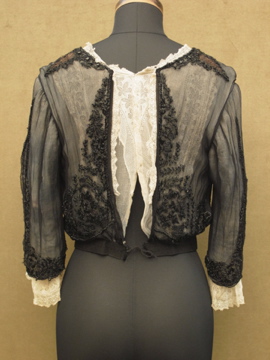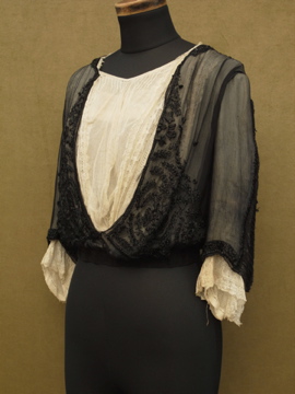 1910年代頃につくられたシルクシフォンのトップ。黒いシルクシフォン地の下は白のシルクシフォン地の二枚仕立てになっています。フロント、バック、袖口には繊細なレースが使われています。表には黒糸の細かいて刺繍が施され、所々使われたメタル糸やグラスビーズも落ち着いた美しさがあります。バックをホックで留める仕様。内側の白い布地部分に表地の黒い色がムラになって移っています。全体的に小さな穴やシミなどの経年の傷みがあります。