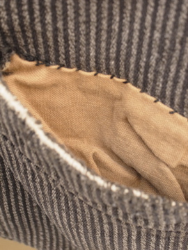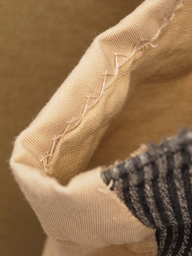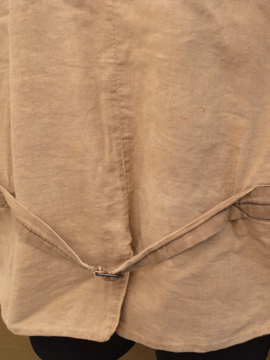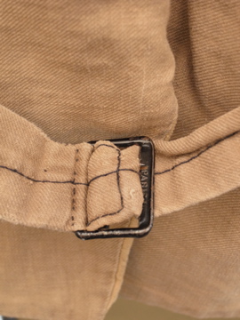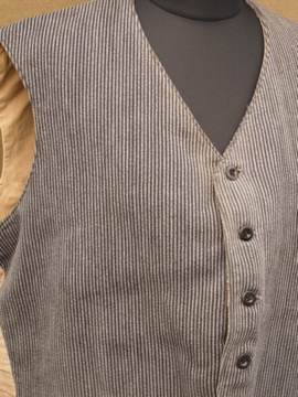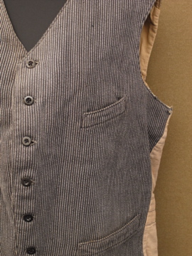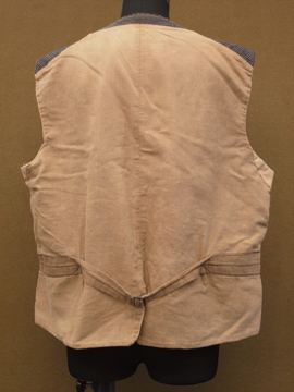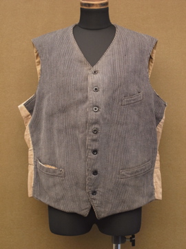 ストライプのコットン生地が良い風合いのワーク・ベスト。1920年から1940年代頃につくられたものだと思います。使い込まれた布地の色目が良いです。バックのストラップでサイズの調節ができます。アームホール、ネック周り、ポケットにスレによる破れや直し痕があります。ボタンは付け替えられており、プラスチック製。小さなシミ等、全体的に経年の傷みが見られます。