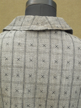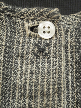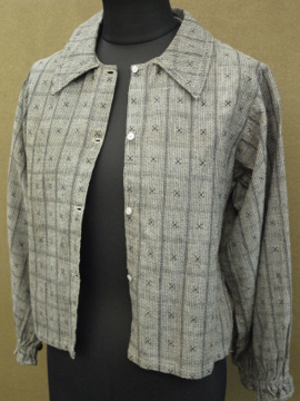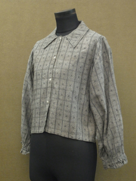 20世紀初期頃につくられたブラウス。珍しい織り柄のコットン素材です。短い着丈、広めにつくられた襟で可愛らしさがあります。ボタンは貝製。襟や全体的に黄ばみがみられますが、その他の状態は良いです。素朴な良い品です。