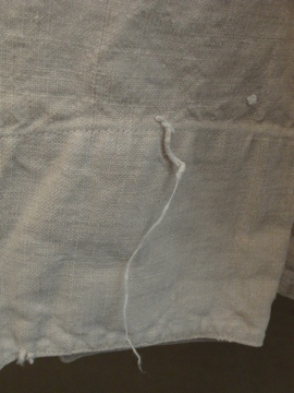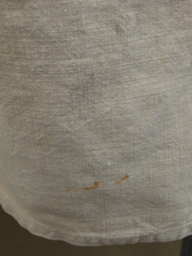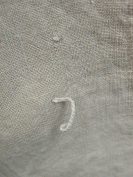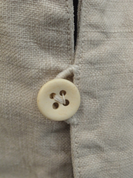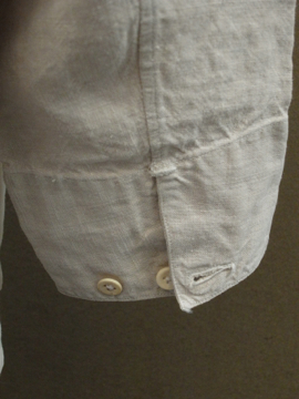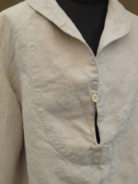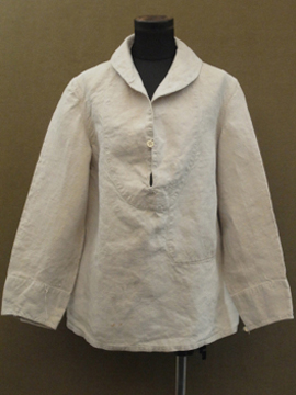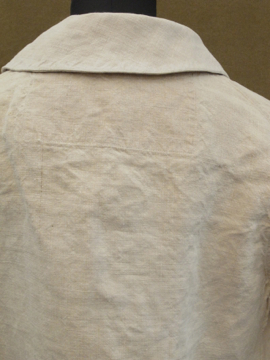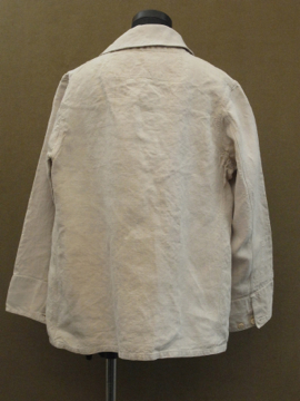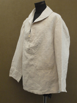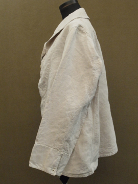 1930年代につくられたフランス海軍のリネン・セーラートップ。ナチュラルな色目の目の詰まった良いリネン素材です。ショールカラーでボタンが一つ、シンプルで使いやすいです。ボタンはボーン製、リネンの色と良く合います。内側左にポケットがあります。章を引っかけて留めるための受けが袖等についているのですが、切れている部分があります。全体的に汚れやシミ、ほつれやスレ等の経年の傷みがあります。ダメージを味として楽しめる方にお勧めいたします。