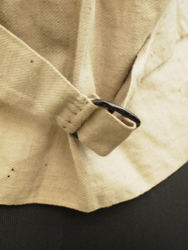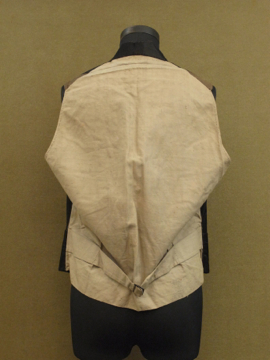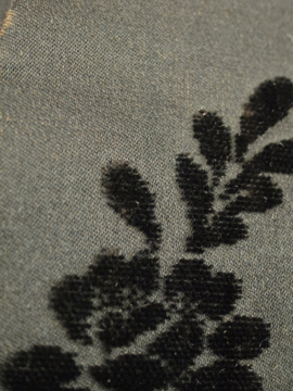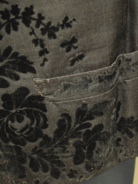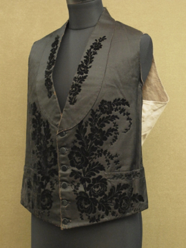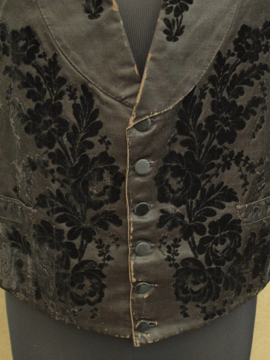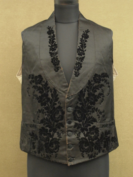 19世紀後期から20世紀初期頃につくられた花模様のアンティーク・ベスト。前身頃はシルクとコットン、後身頃はコットン素材、襟裏やポケット内にはリネン素材が使われています。花模様の起毛した部分もシルクが使われ、光沢があり美しいです。ショールカラーとシルクの光沢のある素材感、花模様で上品な印象。全て手縫いで細かく丁寧につくられています。バックのストラップで身幅の調節ができます。フロントのボタンはシルクの包みボタンですが、擦れて中のメタルが見えているものがあります。前立て部分や襟、裾等の擦れやすいところにダメージがあり全体的に汚れ等の経年の傷みがありますが、良い風合いがあります。
