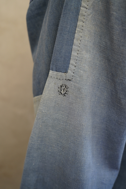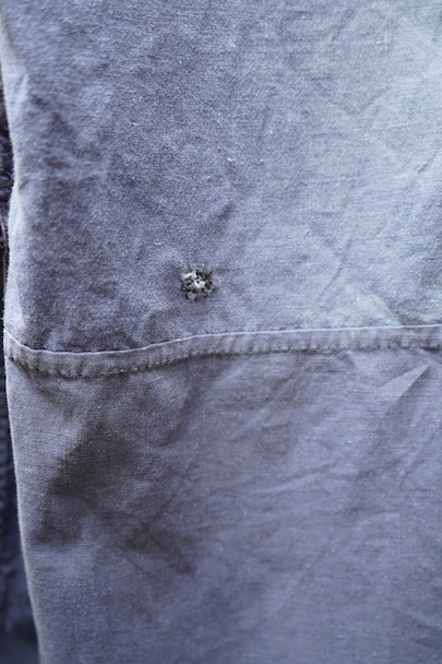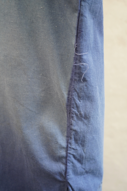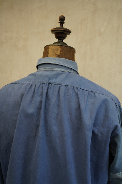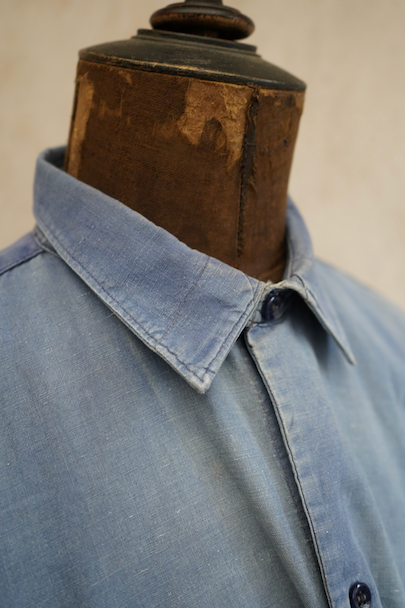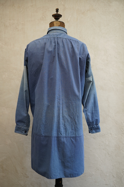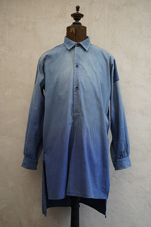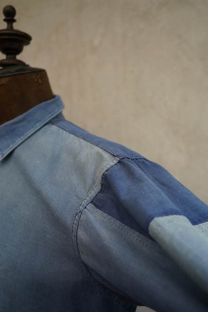 1940年代頃につくられたプルオーバータイプのブルー・ワークシャツ。使い込まれて布を接いだ直しがされた味わいのある1着です。手縫いの直し痕、小さな穴、色褪せなど、使用感があります。襟もひっくり返して付け直されています。