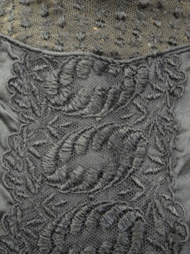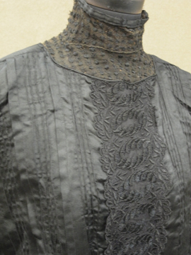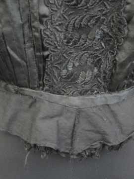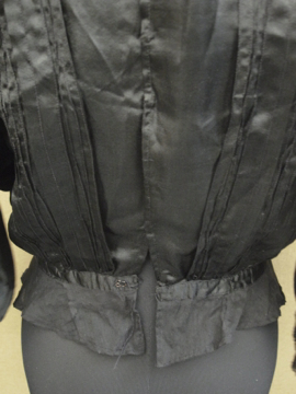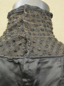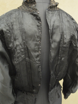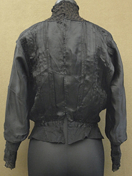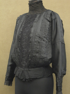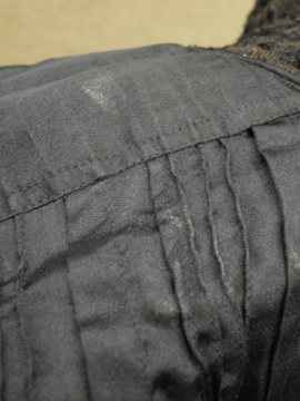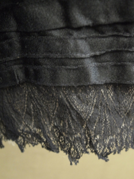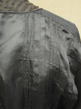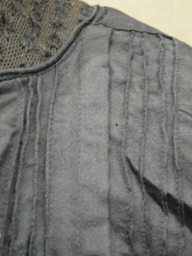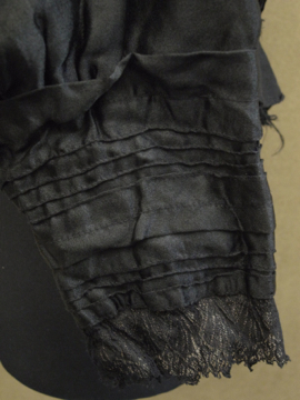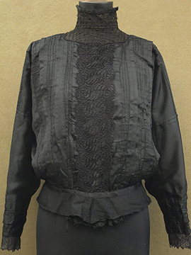 1900年から1910年代頃につくられたブラウス。おそらくレーヨンだと思いますが、セルロース系の光沢のある柔らかく軽い素材感の布地です。裏地にはガーゼのようなコットン地が使われています。全体的に細かいピンタックが施され、部分的に使われたレースがポイントになっています。レースはネックと胸部分、袖口で別柄のものが使われています。バックをスナップボタンで留める仕様。レースでつくられたハイネックのネックラインの内側にはワイヤーが入って成形されています。フロントの裾は切りっぱなし。小さな汚れ、小さな穴、ほつれ等が数カ所ありますが、年代を考えると非常に状態が良いです。
