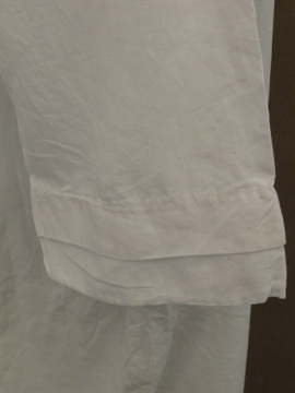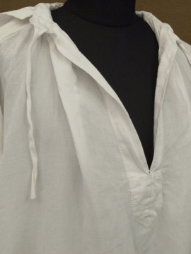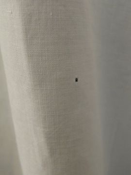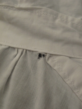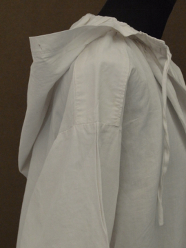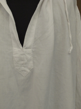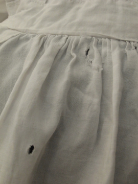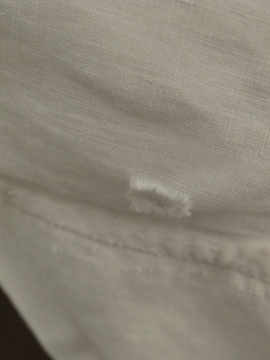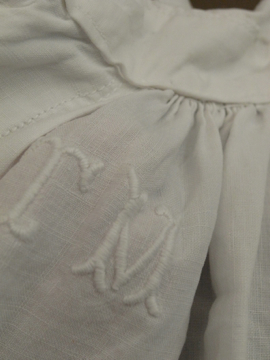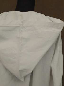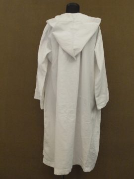 20世紀初期頃につくられたフード付きスモック。薄くて目の詰まったリネン素材で、しっとりとした柔らかな質感の良い布地でできています。フードと袖口、肩のヨーク部分はコットン素材です。ネックの近くに白糸で"TM"のイニシャル刺繍が施されています。ネック周りを中心に0.1cmから0.5cmの穴がいくつかあります。その他、全体的に小さな穴やスレ、ほつれ、汚れ等の経年の傷みがあります。このようなフードのついたものでこの素材は珍しいです。ダメージを気にされない方にお勧めいたします。