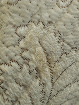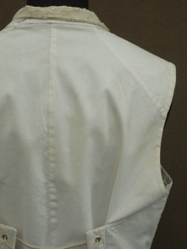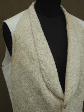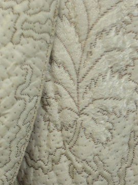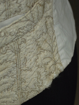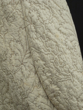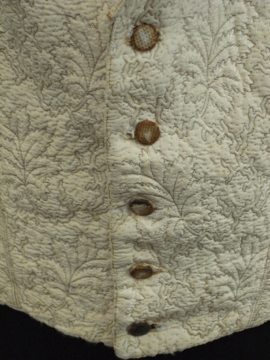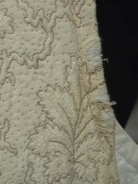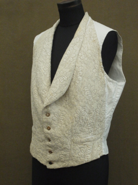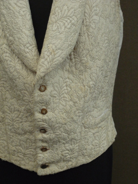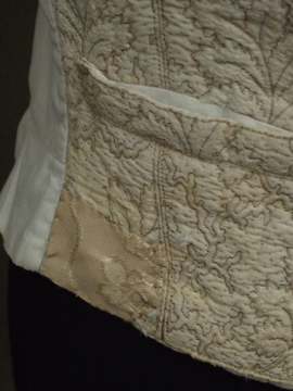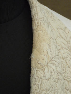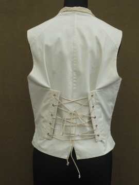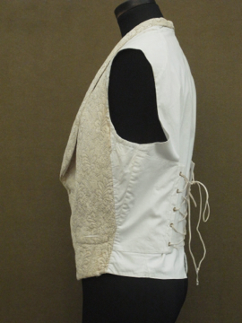 19世紀につくられたジレ。前身頃にシルク地にメタル糸で植物の模様が入ったキルティングが使われた珍しい品です。 細かい切り替えやダーツが入り、身体のラインに沿った立体的なつくりです。バックはレースアップで古い仕様、美しいです。ショールカラーで、ポケットは2つです。フロントの包みボタンにサビ染みや裂けてはがれている等のダメージがあります。フロント右下にパッチされた直し、その他、全体的にスレ、黄ばみや汚れ、シミ等の傷みがあります。珍しい品ですので、ダメージを気にされない方にお勧めいたします。