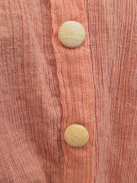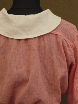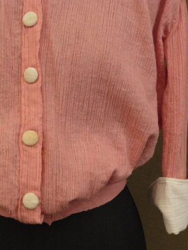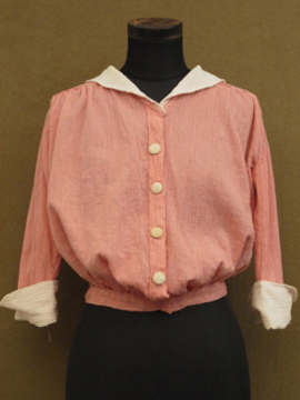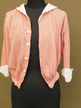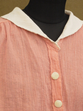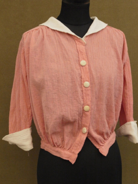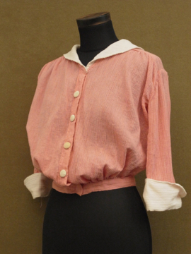 1920年から1930年代頃につくられたブラウス。シワ加工された薄手のコットン素材です。可愛らしいピンクに白い襟や袖、ボタンがアクセントになっています。短い着丈でウエスト部分は細め、ウエスト上にギャザーが入った時代を感じさせるつくりが良いです。フロントのボタンは飾りで、裏にホックがついています。ボタンに黄ばみ、全体的に小さなほつれやツレ等の若干の傷みがあります。一番下のホックを外して着用しても可愛いです。